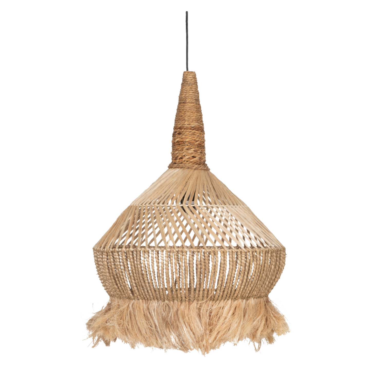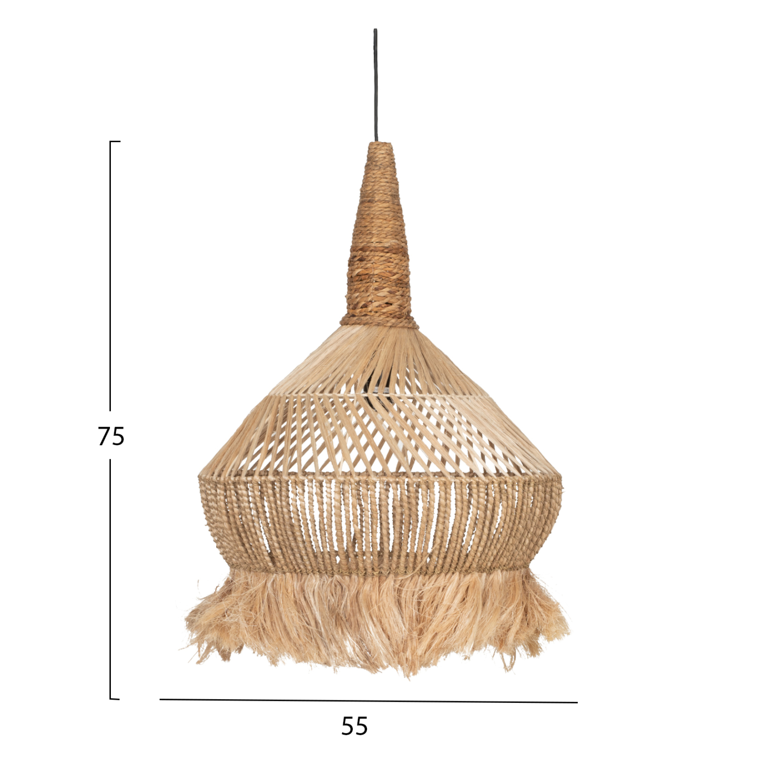 Hm7774- Kρεμαστό φωτιστικό—- Αν επιθυμείτε να διακοσμήσετε το χώρο σας με ένα φωτιστικό σε boho στυλ, αυτό θα σας ενθουσιάσει. Είναι ένα μονόφωτο φωτιστικό με περίτεχνο «καπέλο» φτιαγμένο από σκοινί και ίνες κάνναβης Μανίλας και μπανάνας. Το ιδιαίτερο χαρακτηριστικό, όμως, αυτού του φωτιστικού είναι ότι το «καπέλο» καταλήγει σε κρόσια, επιτείνοντας ακόμα περισσότερο το boho στυλ.