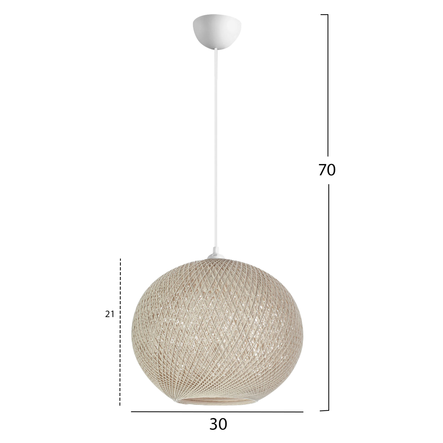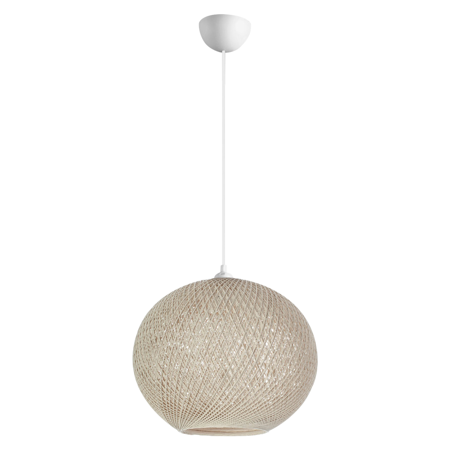 Είναι ένα μονόφωτο φωτιστικό σε σχήμα ελαφρώς ελλειπτικό σφαιρικό και είναι επενδυμένο με λεπτό πλεκτό σκοινί, υψηλής ποιότητας και αντοχής στο χρόνο, σε ΕΚΡΟΥ απόχρωση.