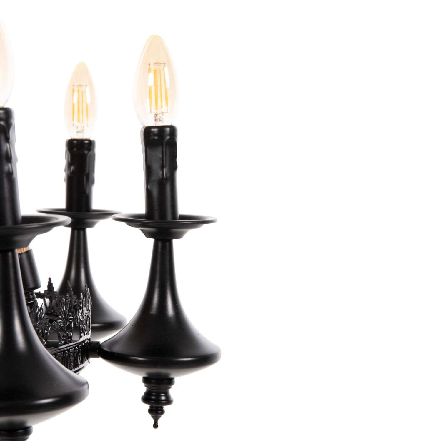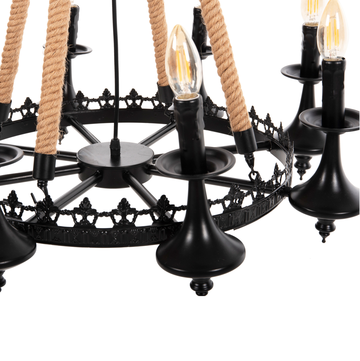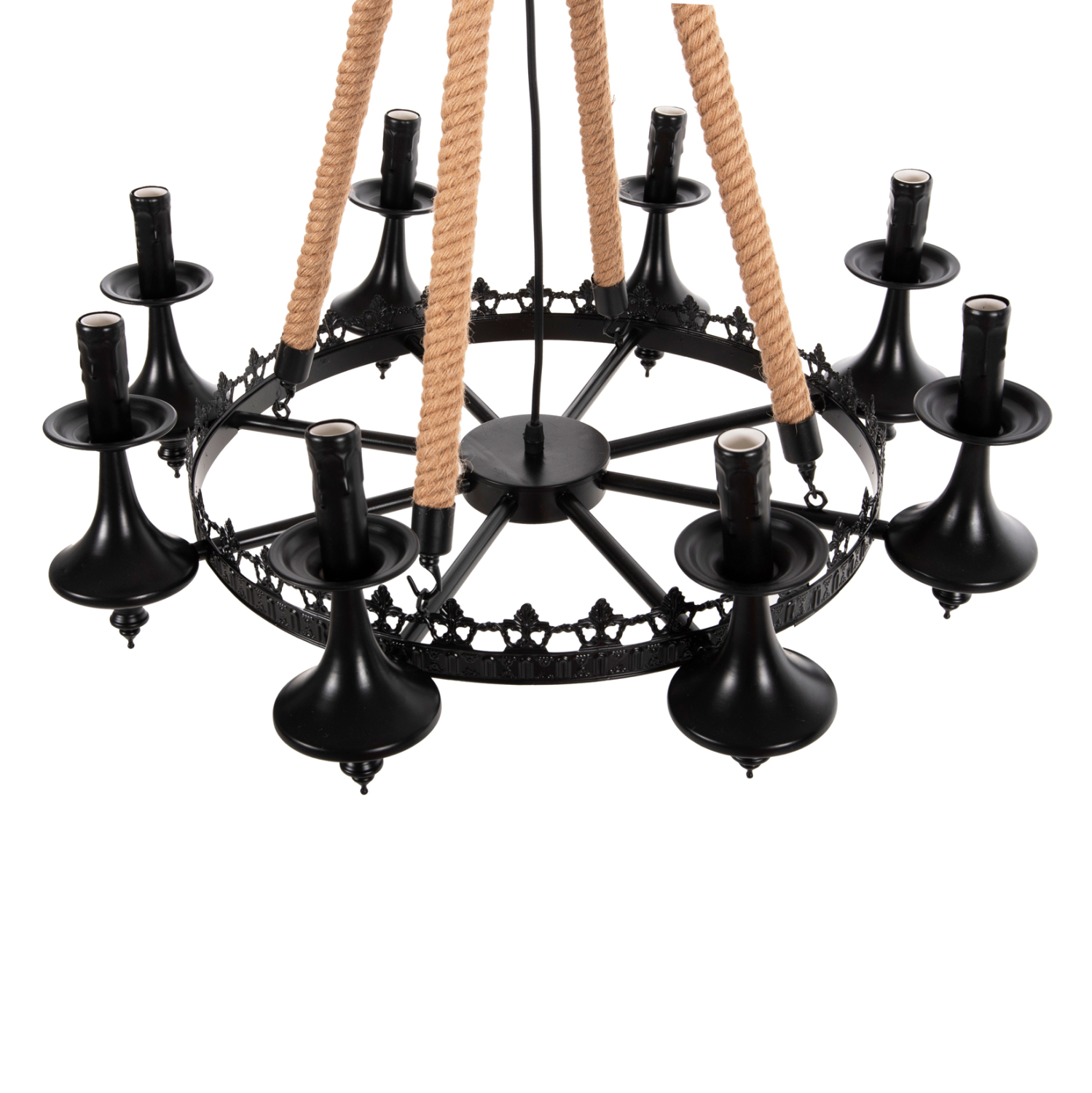 Το πολύφωτο ΗΜ4169 είναι μια ακόμα εντυπωσιακή προσθήκη στην γκάμα μας. Ο μαύρος μεταλλικός σκελετός του είναι κυκλικός και κρέμεται με αλυσίδα από την οροφή. Στον κυκλικό σκελετό είναι μονταρισμένα τα 8 φώτα σε μορφή κηροπηγίων, ενώ την εικόνα συμπληρώνουν τα σχοινιά που δίνουν την αίσθηση πολυελαίου στο φωτιστικό. Αυτό το πολύφωτο θα φωτίσει με άπλετο φως μεγάλους χώρους και θα εντυπωσιάσει με το όμορφο design του.