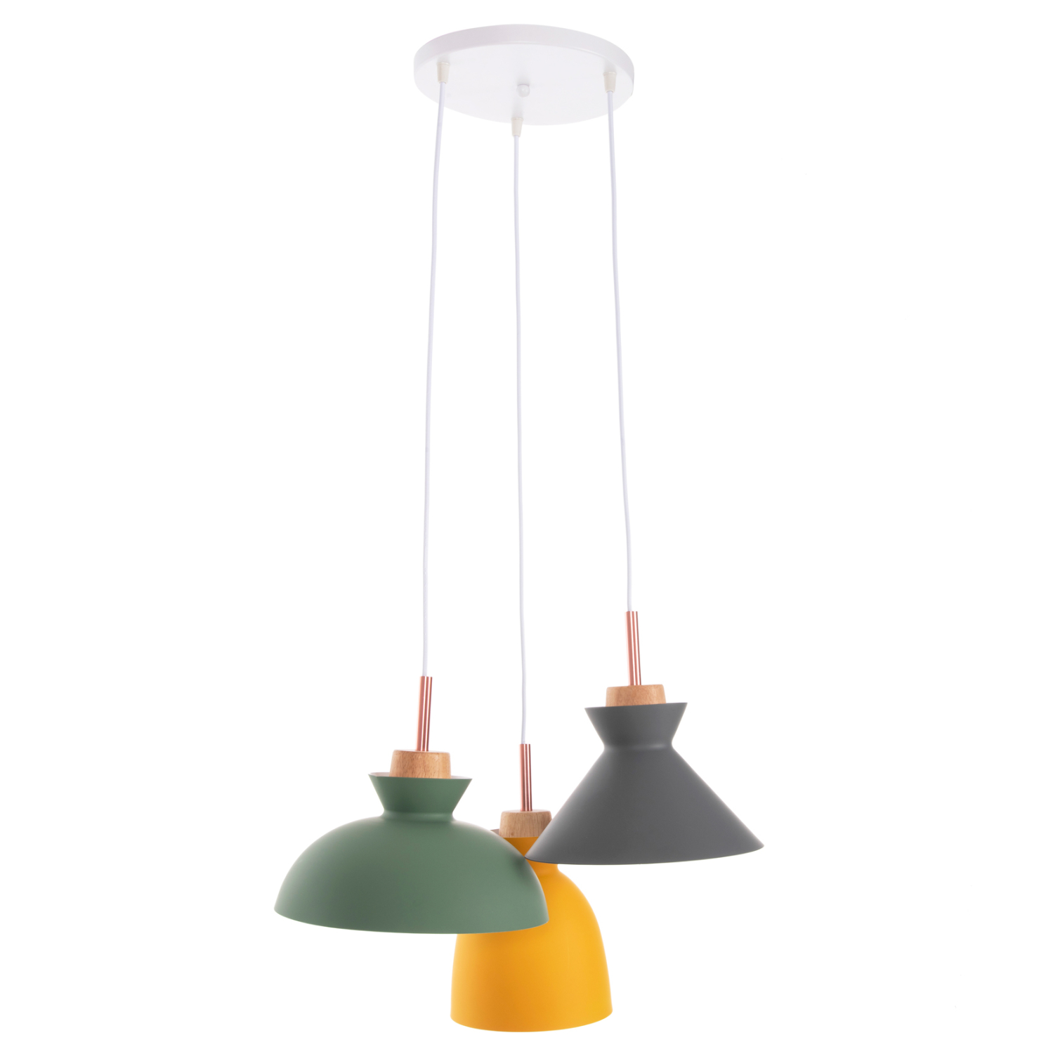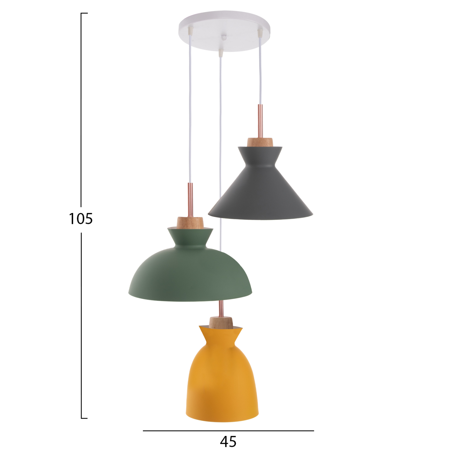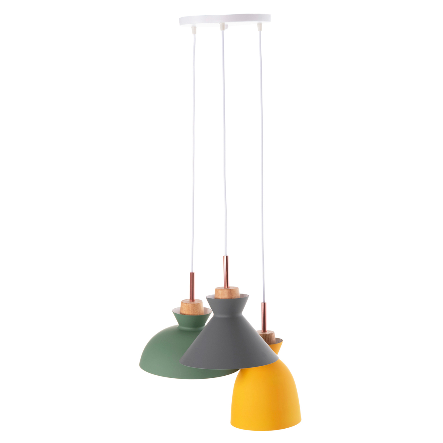 Ανακαλύψτε το όμορφο 3-φωτο φωτιστικό οροφής HM4141. Ένα φωτιστικό που θα συμπληρώσει την διακόσμηση του σαλονιού, χάρη στα 3 καπέλα με διαφορετικό σχήμα και διαφορετικό χρώμα η κάθε μια. Τα 3 χρώματα (γκρι-πράσινο-κίτρινο) συνοδεύονται με την λεπτομέρεια από ξύλο, από το οποίο κρέμονται τα καπέλα και φτάνει μέχρι το ντουί βιδώματος της λάμπας.