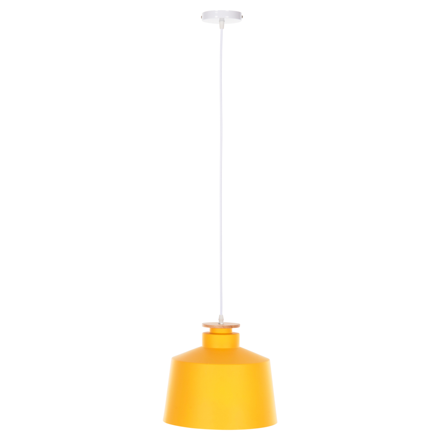 Ανακαλύψτε αυτό το νέο μας κρεμαστό φωτιστικό οροφής και ολοκληρώστε την διακόσμησή σας. Πρόκειται για ένα φωτιστικό με ΚΙΤΡΙΝΟ καπέλο αλουμινίου σε σχήμα καμπάνας με λεπτομέρεια ξύλου στην κορυφή του φωτιστικού. Αισθητικά, ολοκληρώνεται με το λευκό καλώδιο κρέμασης και την λευκή βάση οροφής, και αποτελεί την τελευταία τάση στα φωτιστικά οροφής.