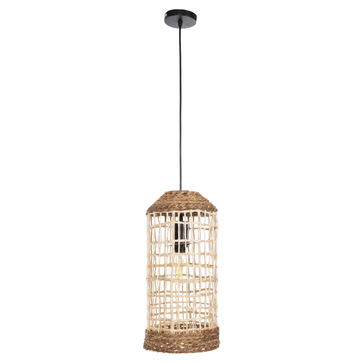 Hm7768- Kρεμαστό φωτιστικό—- Αν επιθυμείτε να διακοσμήσετε το χώρο σας με ένα φωτιστικό σε πολύ ιδιαίτερο στυλ, αυτό είναι η πιο σωστή επιλογή. Είναι ένα μονόφωτο φωτιστικό με μακρύ κυλινδρικό «καπέλο» σε στυλ κλουβί, φτιαγμένο από ίνες κάνναβης Μανίλας ή αλλιώς αμπακά, σε φυσικό χρώμα.