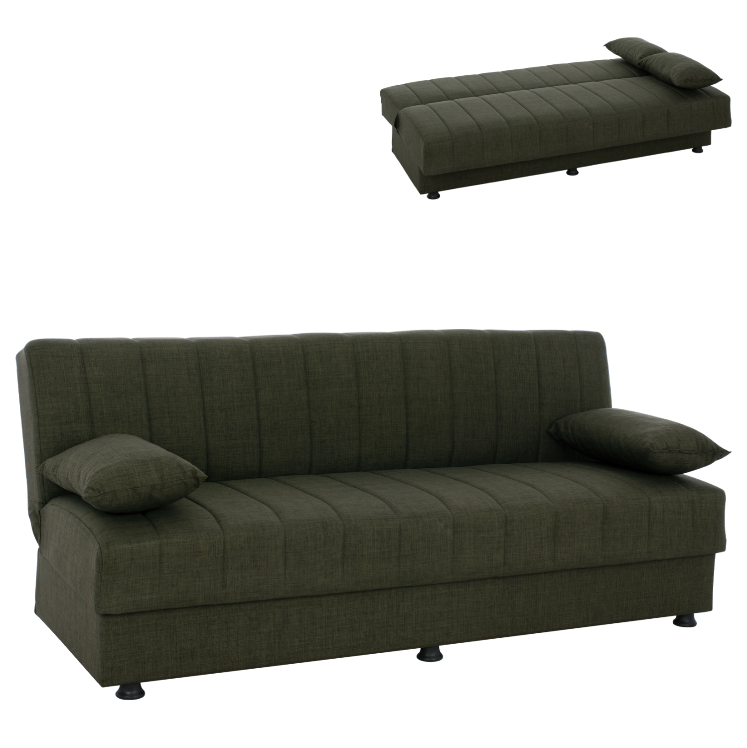Ξεκινώντας από τα βασικά και τα προφανή, το χρώμα της επένδυσης με το εξαιρετικό και καλοραμμένο ανάγλυφο ύφασμα αυτού του καναπέ, είναι dark olive. Διαθέτει 2 μικρά μακρόστενα μαξιλάρια με το ίδιο ύφασμα που μπορούν να χρησιμοποιηθούν όπως θέλει ο καθένας. Χαρακτηριστικό αυτού του καναπέ είναι ότι δεν διαθέτει μπράτσα με αποτέλεσμα να μην περιορίζει την χρήση του από τους χρήστες του. Επίσης, γίνεται πολύ εύκολα κρεβάτι μέσω ενός εύχρηστου μηχανισμού (κλικ-κλακ) πολλαπλασιάζοντας την χρησιμότητά του. Κάτω από το κάθισμα του καναπέ υπάρχουν 2 αποθηκευτικοί χώροι με ενισχυμένο πάτωμα καθιστώντας τον ένα πραγματικό πολυεργαλείο, ειδικά για φοιτητικά σπίτια αλλά και σπίτια με περιορισμένο γενικά χώρο.