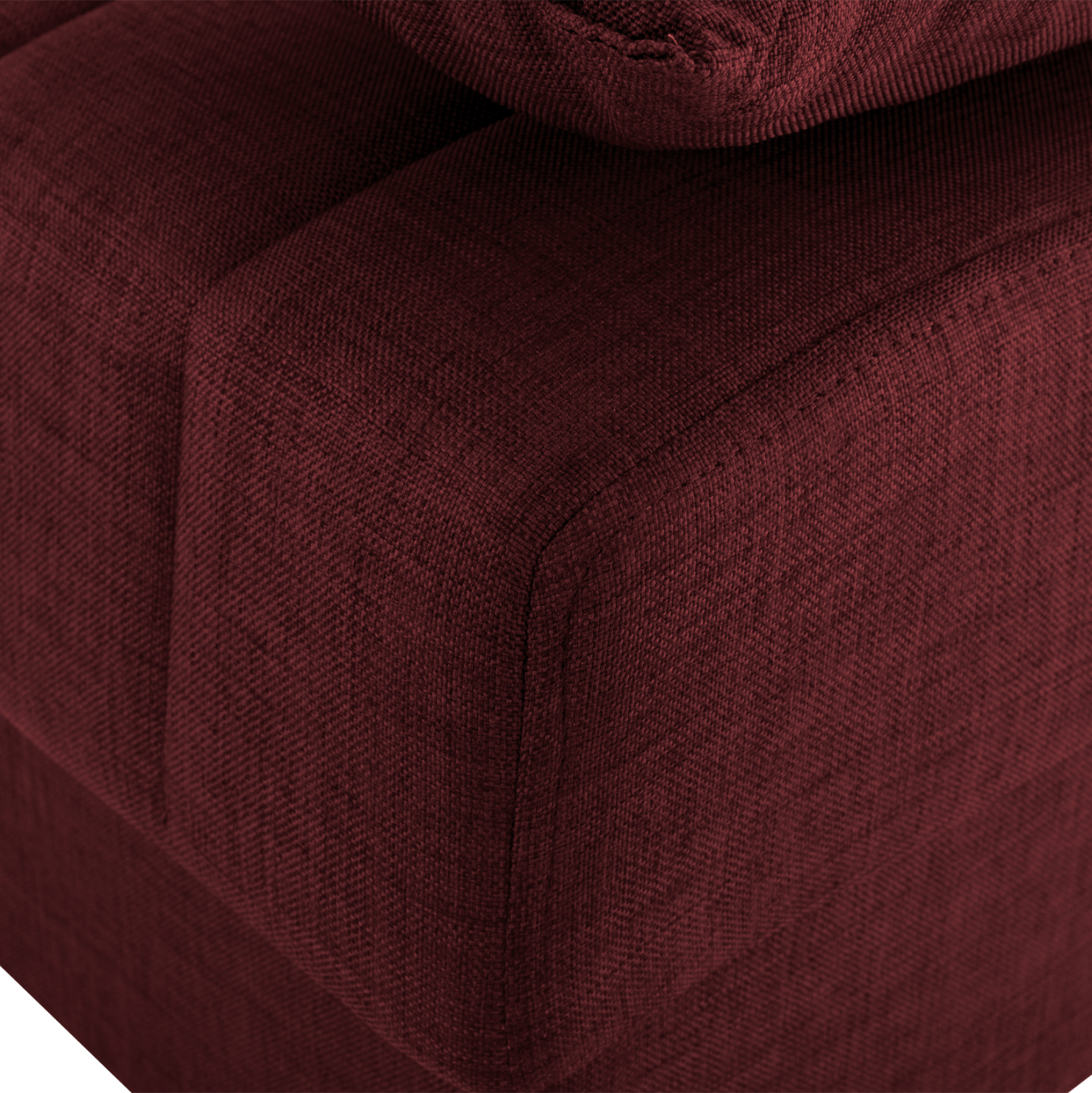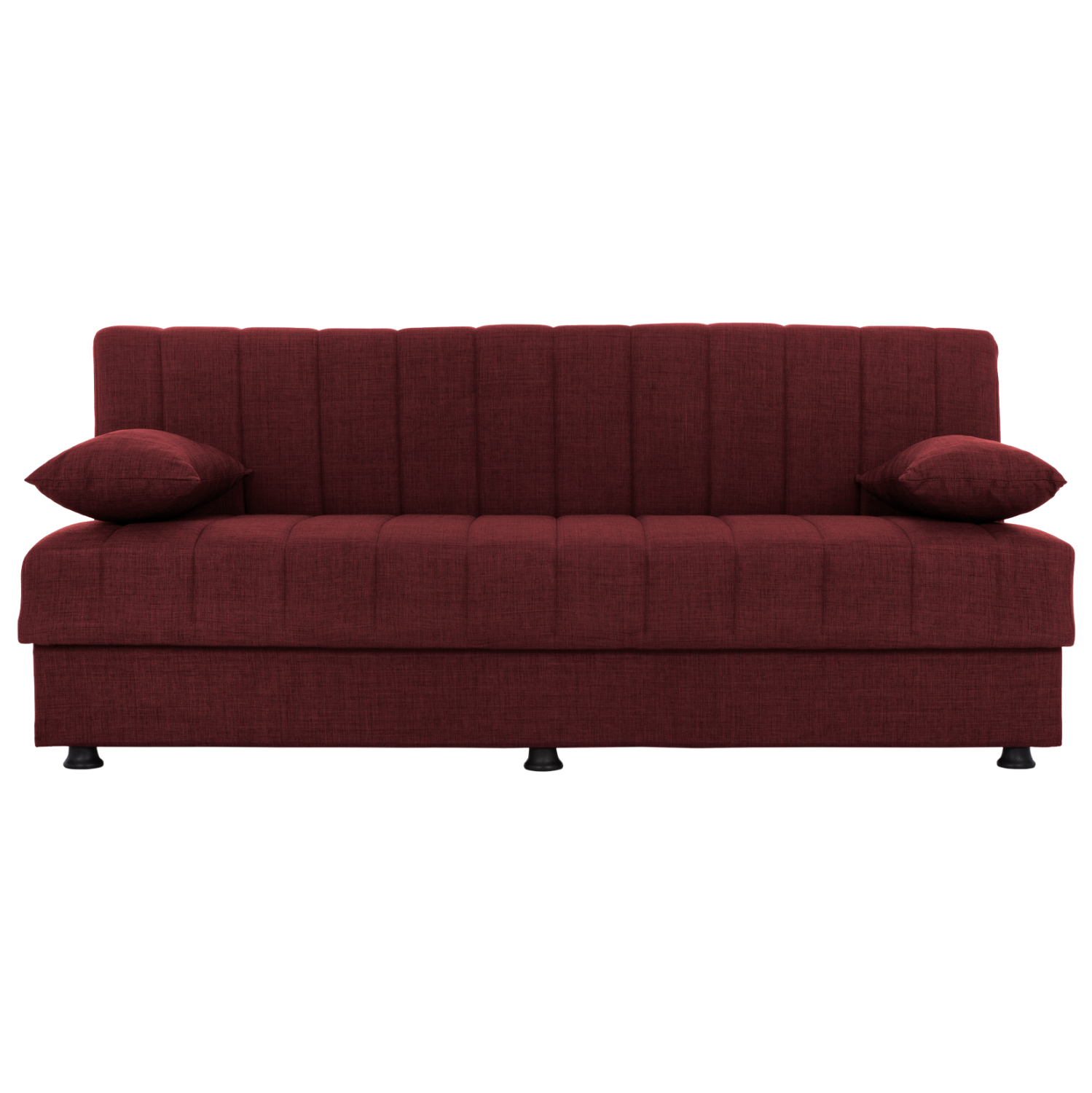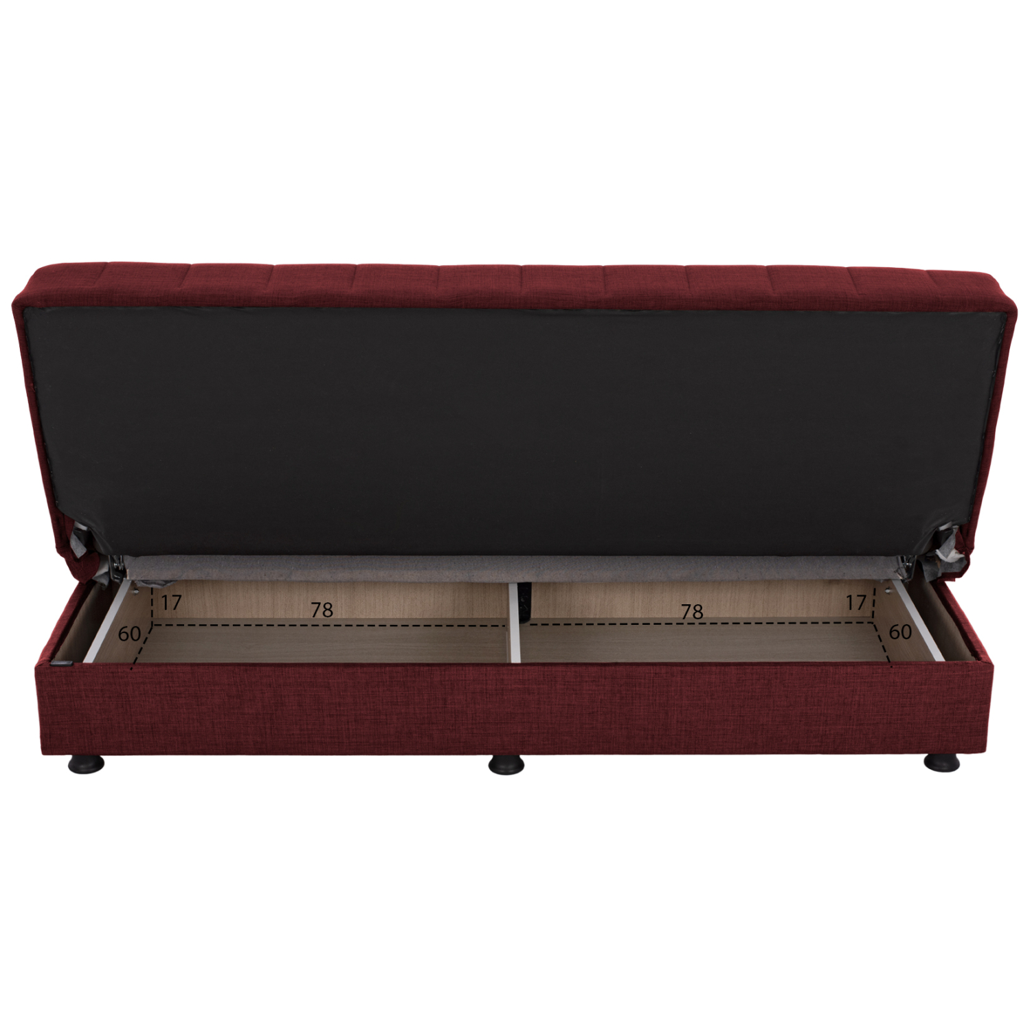 Ξεκινώντας από τα βασικά και τα προφανή, το χρώμα της επένδυσης με το εξαιρετικό και καλοραμμένο ανάγλυφο ύφασμα αυτού του καναπέ, είναι κόκκινο. Διαθέτει 2 μικρά μακρόστενα μαξιλάρια με το ίδιο ύφασμα που μπορούν να χρησιμοποιηθούν όπως θέλει ο καθένας. Χαρακτηριστικό αυτού του καναπέ είναι ότι δεν διαθέτει μπράτσα με αποτέλεσμα να μην περιορίζει την χρήση του από τους χρήστες του. Επίσης, γίνεται πολύ εύκολα κρεβάτι μέσω ενός εύχρηστου μηχανισμού (κλικ-κλακ) πολλαπλασιάζοντας την χρησιμότητά του. Κάτω από το κάθισμα του καναπέ υπάρχουν 2 αποθηκευτικοί χώροι με ενισχυμένο πάτωμα καθιστώντας τον ένα πραγματικό πολυεργαλείο, ειδικά για φοιτητικά σπίτια αλλά και σπίτια με περιορισμένο γενικά χώρο.