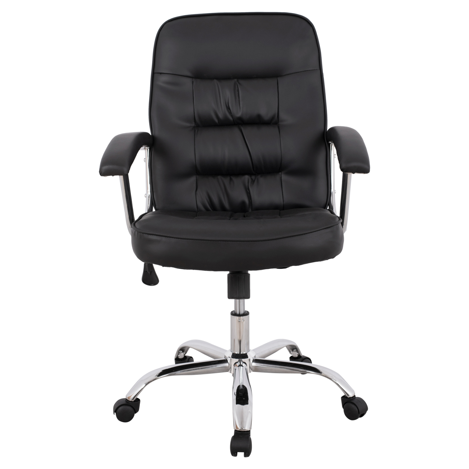 Διευθυντική καρέκλα γραφείου “RYLIE” σε μαύρο χρώμα. Μια «πλούσια» καρέκλα γραφείου με ψηλά μπράτσα με ελαφριά κλίση, επενδυμένα με μια λεπτή στρώση αφρολέξ σε PU δέρμα. Η πλάτη είναι ημίψηλη με πλούσια στρώση από αφρώδη υλικά για άνεση κατά την χρήση και υποστηρίζει ολόκληρο τον κορμό σας, ενώ είναι επενδυμένη με υψηλής ποιότητας PU δέρμα, όπως επίσης και το αναπαυτικό κάθισμα. Η βάση είναι χρωμιωμένη σε σχήμα «αστέρι» με κυρτά πόδια και μαύρα ροδάκια.