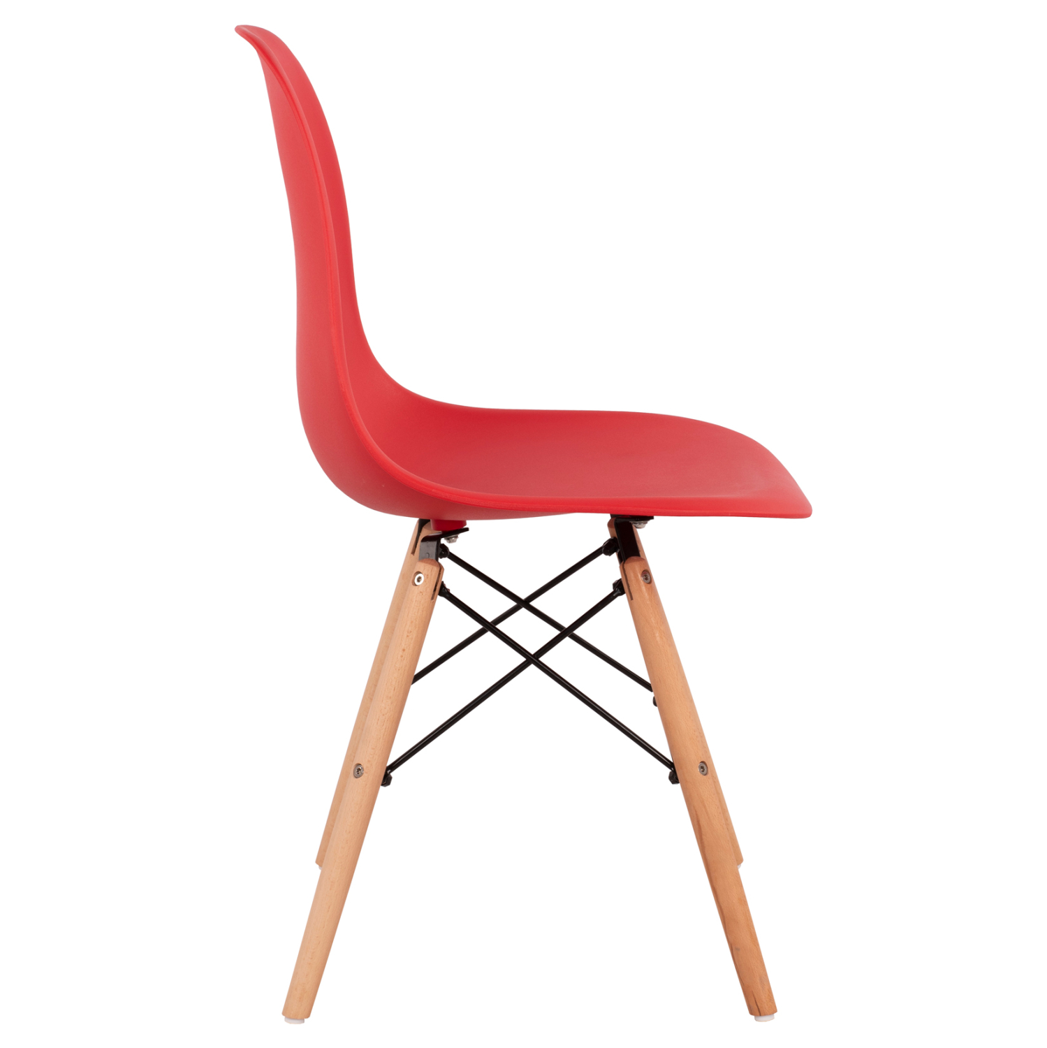 Μία μοντέρνα καρέκλα κατασκευασμένη από ξύλινο σκελετό και κάθισμα πολυπροπυλενίου σε κόκκινη απόχρωση.
