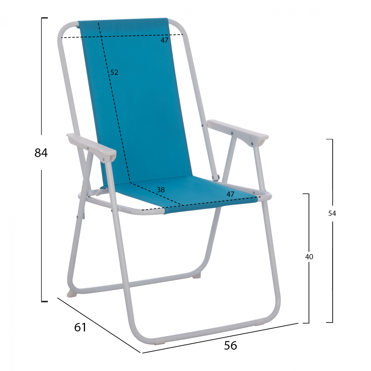 Καρέκλα παραλίας πτυσσόμενη μεταλλική με ψηλή πλάτη και σιέλ ύφασμα.