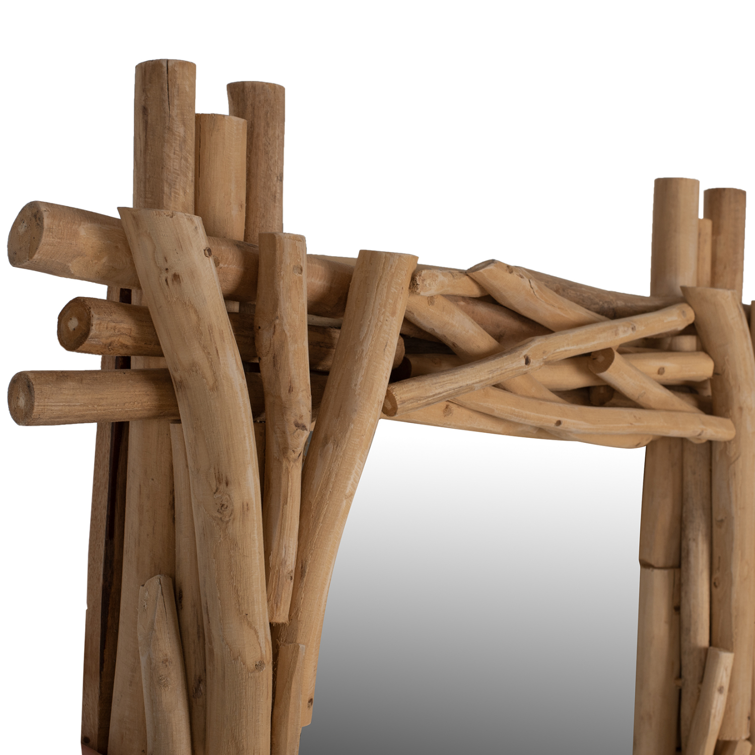 O καθρέπτης ΗΜ9372 είναι πραγματικά ένα εντυπωσιακό κομμάτι στην διακόσμηση του σπιτιού σας! Το design του είναι μοναδικό με τον καθρέφτη να βρίσκεται σε ένα μεγάλο ορθογώνιο πλαίσιο από μασίφ κλαδιά του δέντρου ΤΕΑΚ. Αισθητικά αποτελεί κυρίως ένα κομμάτι διακόσμησης παρά ένας κανονικός καθρέπτης, μαγνητίζοντας τα βλέμματα. Τα ξύλα είναι στο φυσικό τους χρώμα και οι διαστάσεις όλης της κατασκευής είναι ικανοποιητικές.