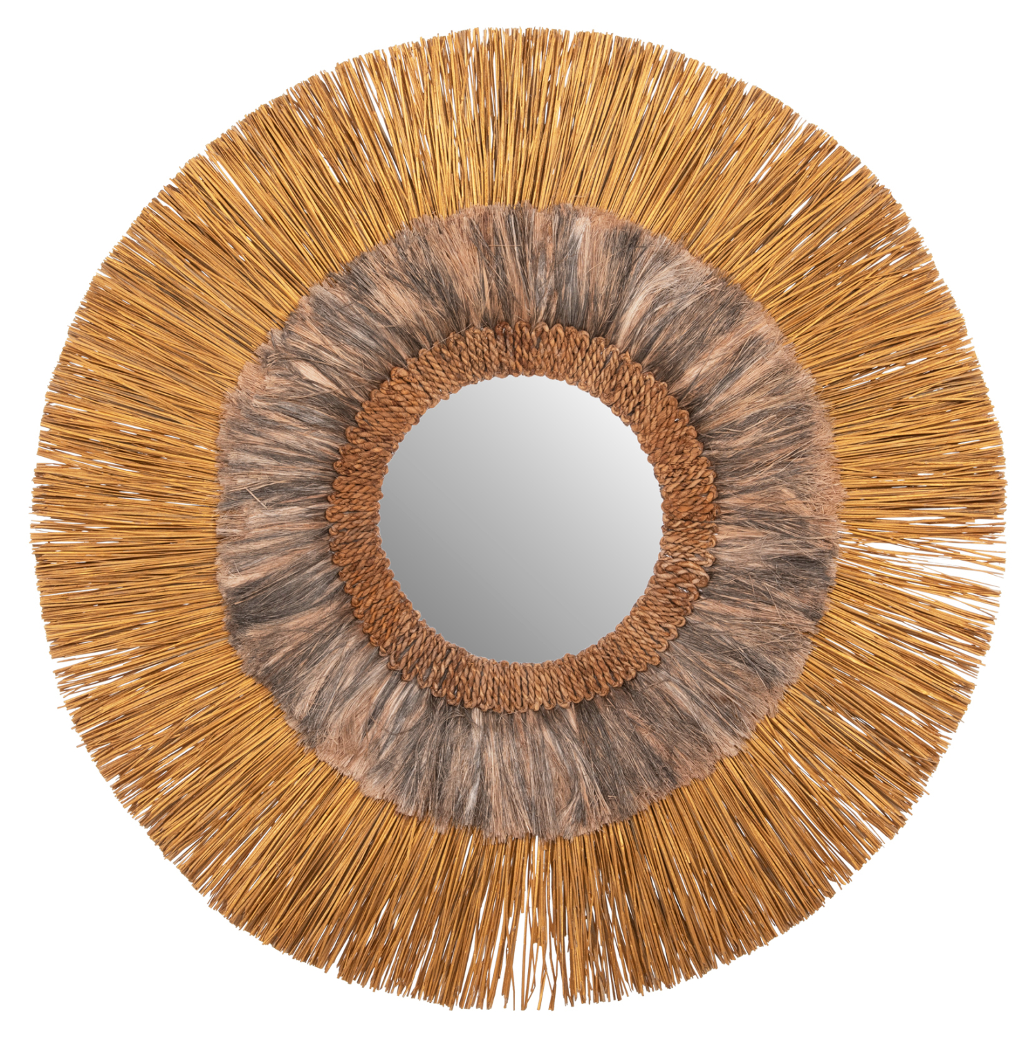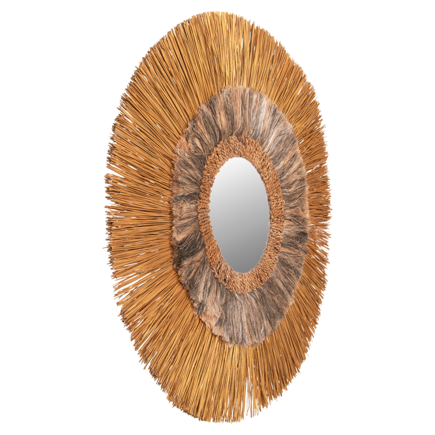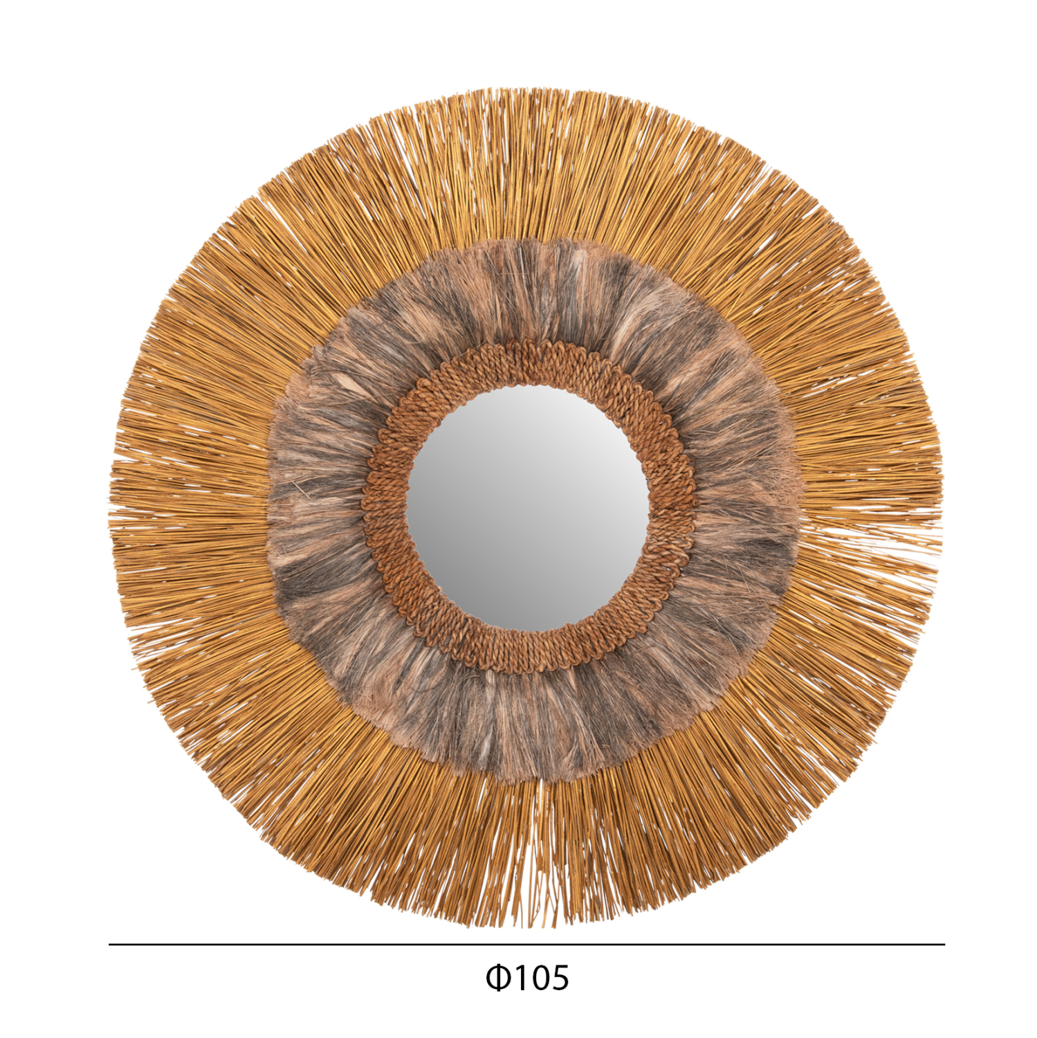 O στρογγυλός καθρέπτης ΗΜ7796 είναι πραγματικά ένα εντυπωσιακό κομμάτι στην διακόσμηση του χώρου σας! Το design του είναι όμορφο με πλαίσιο από 2 δακτυλίους με φυσικά υλικά. Ο μικρότερος δακτύλιος αποτελείται από ίνες κάνναβης Μανίλας σε black wash χρώμα, ενώ ο μεγαλύτερος δακτύλιος αποτελείται από Mendong Grass σε χρυσό χρώμα. Ο καθρέπτης στο κέντρο συμπληρώνει με όμορφο τρόπο αυτό το διακοσμητικό κυρίως κομμάτι.