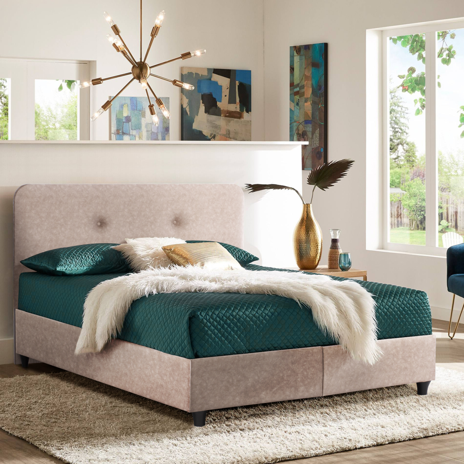 Η επένδυση έχει γίνει εξολοκλήρου από ανάγλυφο ύφασμα τύπου NUBUCK εξαιρετικής ποιότητας, χαρίζοντας ελκυστική όψη και μια εκλεπτυσμένη γοητεία στην διακόσμηση του υπνοδωματίου.