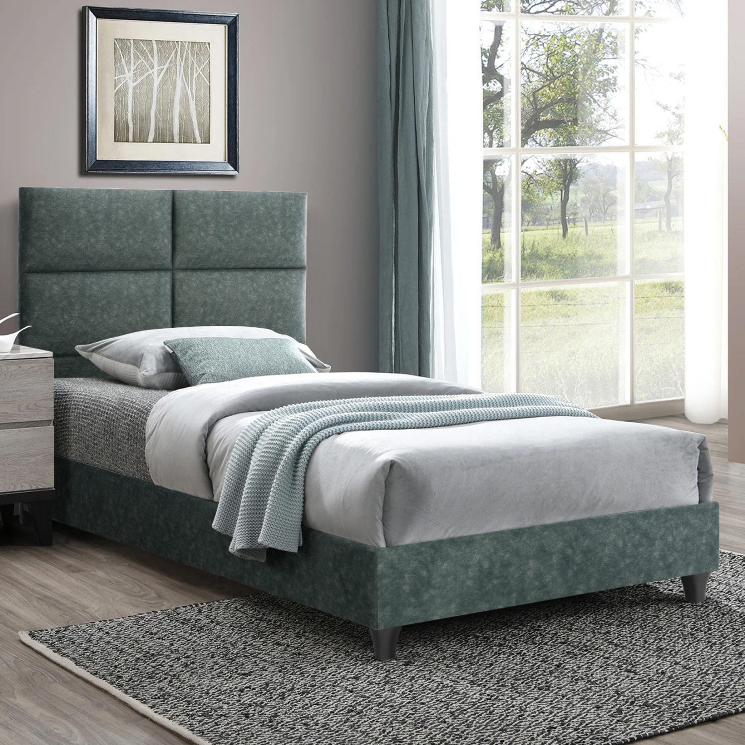Το κρεβάτι MILO έχει ψηλό κεφαλάρι, επενδυμένο με καπιτονέ τεχνοτροπία σε μεγάλα ορθογώνια, ενώ και όλη η επένδυση του κρεβατιού είναι από ανάγλυφο ύφασμα τύπου NUBUCK. Το ΠΡΑΣΙΝΟ χρώμα σε όλο το κρεβάτι είναι όμορφο και μπορεί να συνδυαστεί με πληθώρα διακοσμητικών μοτίβων.