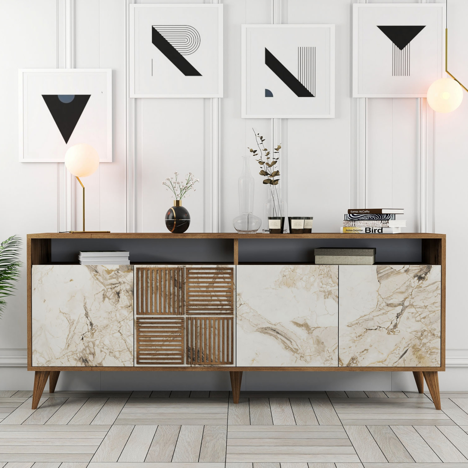 Ο μπουφές ΗΜ9431.03 είναι ένα επιβλητικό έπιπλο όπου κι αν τον τοποθετήσετε. Έχει ψηλά και πλαγιαστά πόδια σε καρυδί απόχρωση και δύο μεγάλα ντουλάπια με ράφι, που ανοίγουν με διπλές πόρτες. Ακριβώς επάνω από τα ντουλάπια και κάτω από την επάνω επιφάνεια υπάρχει ανοιχτός χώρος αποθήκευσης. Το μήκος του εξασφαλίζει ότι η επιφάνεια του είναι μεγάλη και αρκετή για τοποθέτηση πολλών αντικειμένων. Το χρώμα όλης της κατασκευής είναι καρυδί, ενώ όλες οι πόρτες έχουν εφέ λευκού μαρμάρου. Η μία πόρτα, μάλιστα, φέρει και καρυδί λεπτομέρειες. Ο μπουφές αυτός θα σας ενθουσιάσει! Τι είναι όμως ο μπουφές; Ο μπουφές είναι ένα άκρως πρακτικό έπιπλο, αφού στους αποθηκευτικούς του χώρους μπορούμε να βάλουμε από σερβίτσια πιάτων και ποτήρια, μέχρι κεριά και διάφορα άλλα χρηστικά αντικείμενα που έχουμε στο σπίτι μας, ώστε να είναι τακτοποιημένα και να μη δημιουργούν ακαταστασία στο χώρο.