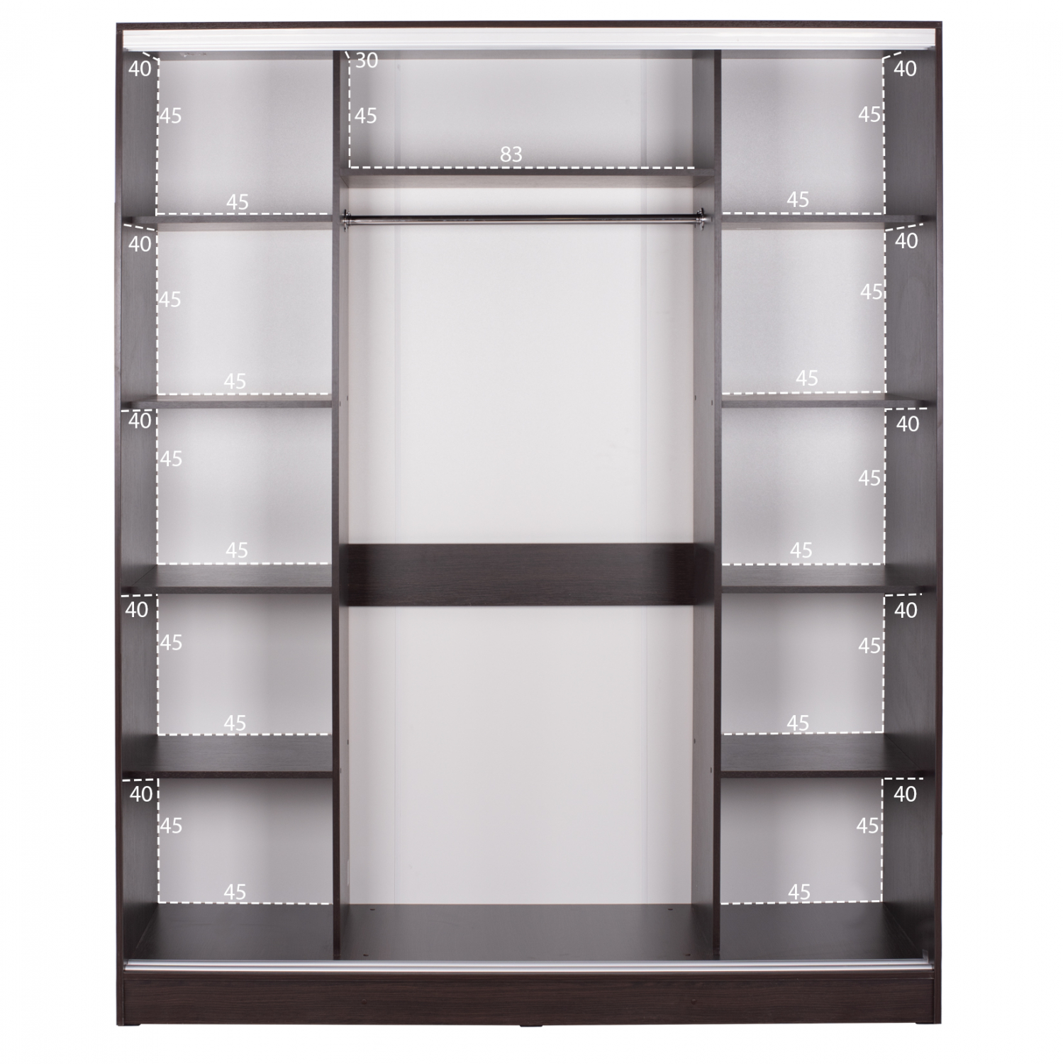Η ντουλάπα υπνοδωματίου διαθέτει λιτό σχέδιο και το εσωτερικό της περιλαμβάνει στις δύο άκρες, δεξιά και αριστερά, ράφια,που δημιουργούν 5 ευρύχωρα ράφια για αποθήκευση.