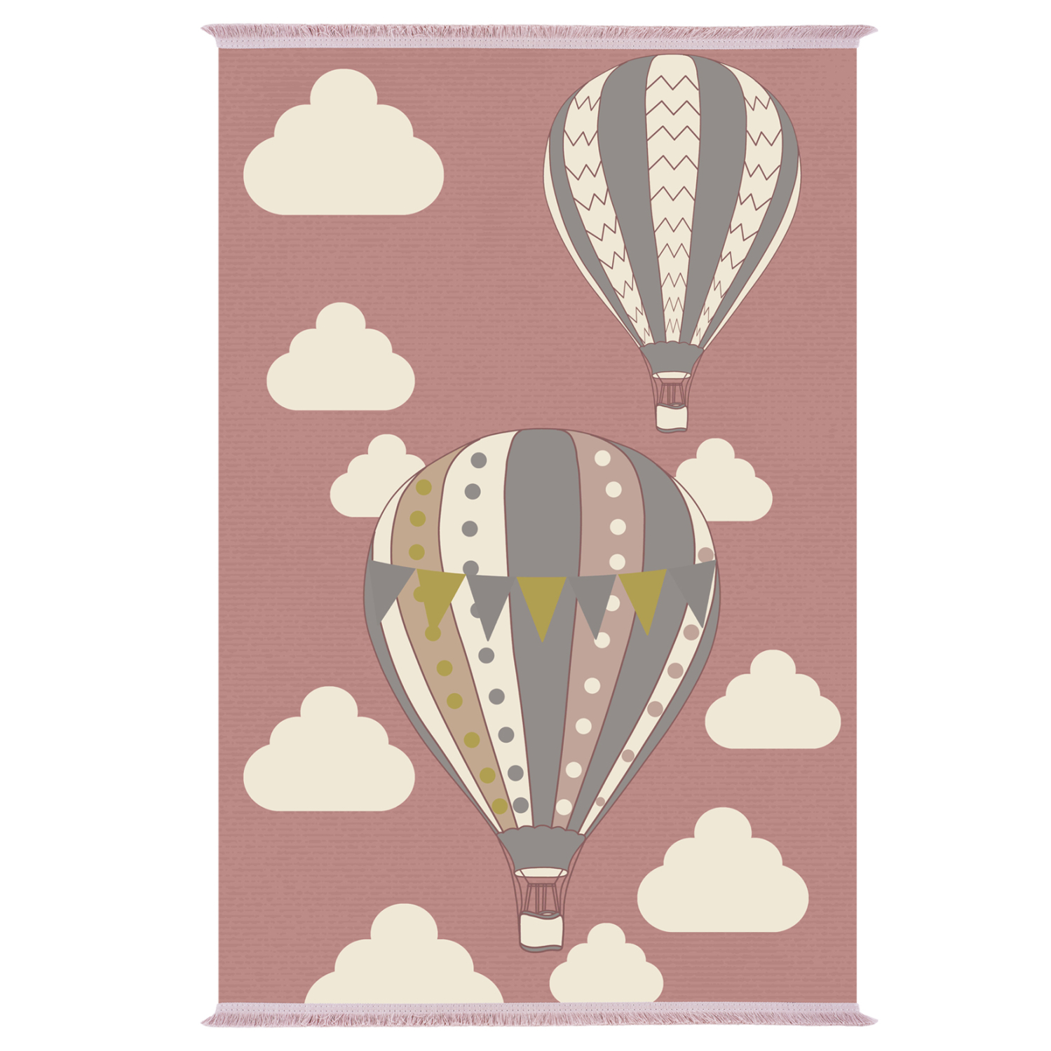 Αυτό το όμορφο χαλί με ΡΟΖ φόντο σε όλη την επιφάνεια του χαλιού, θα μαγνητίσει την φαντασία των μικρών μας φίλων. Το σχέδιο του χαλιού απεικονίζει έναν ουρανό με δύο πολύχρωμα αερόστατα.