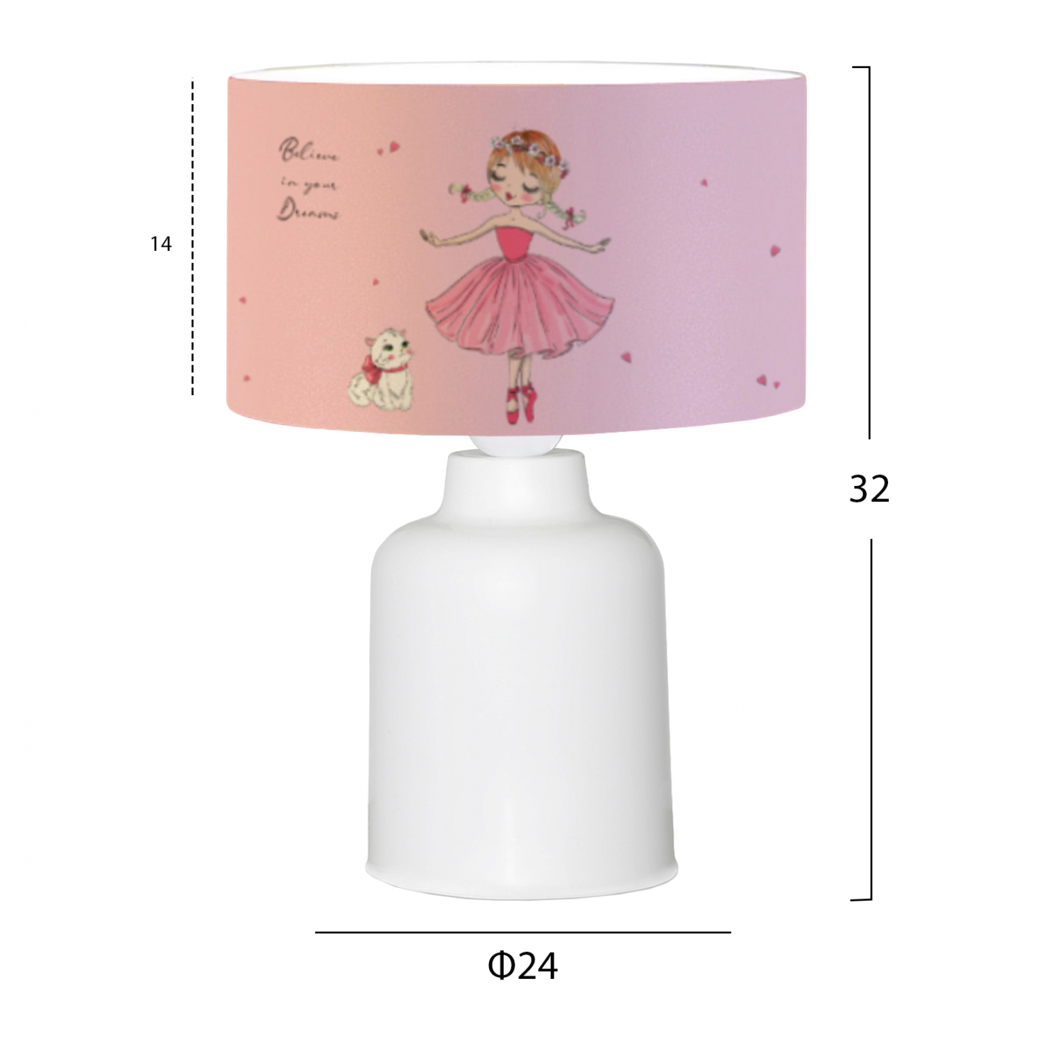 Παιδικό επιτραπέζιο φωτιστικό με βάση πολυαιθυλενίου, υφασμάτινο, σε ροζ απόχρωση, με σχέδιο Ballerina.