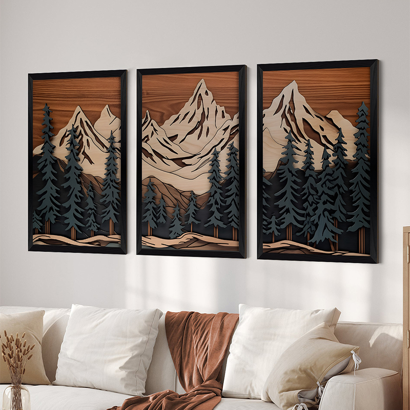 Δώστε βάθος και χαρακτήρα στον χώρο σας με ένα τρίπτυχο που υμνεί το αλπικό τοπίο. Ο μοναδικός σχεδιασμός του, που παίζει με τις αντιθέσεις του φυσικού ξύλου και των σκοτεινών τόνων του δάσους, δημιουργεί ένα επιβλητικό οπτικό αποτέλεσμα που μαγνητίζει το βλέμμα.