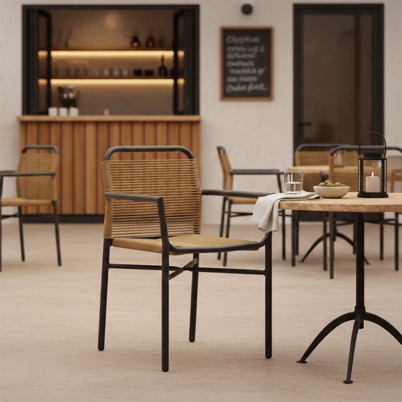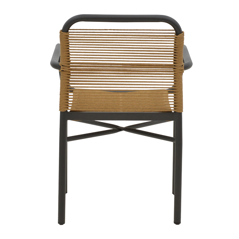 * Κυρίως σώμα καρέκλας από ρατάν. Η κύρια ιδιότητα του ράταν είναι η ευελιξία του, καθώς μπορεί να πλεκτεί και να διαμορφωθεί εύκολα. Επίσης, είναι ανθεκτικό και αντέχει στις καιρικές συνθήκες, καθιστώντας το ιδανικό για επιπλέον εξωτερικούς χώρους.
