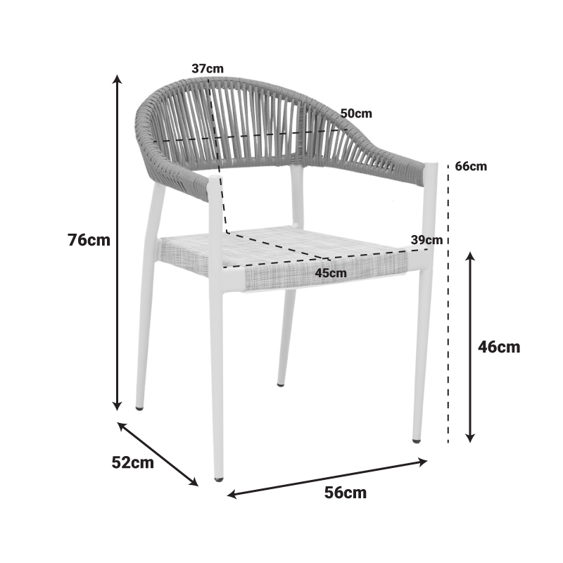 - Έδρα κατασκευασμένη από textilene σε γκρι απόχρωση. Το textilene είναι ένα εξαιρετικά ανθεκτικό υλικό που χρησιμοποιείται ευρέως σε επίπλωση εξωτερικών χώρων και εξαρτήματα. Αποτελείται από πολυεστερικές ινώδεις που επικαλύπτονται με PVC (πολυβινυλοχλωρίδιο), δημιουργώντας ένα υλικό που συνδυάζει ανθεκτικότητα, αντοχή στις καιρικές συνθήκες και εύκαμπτη υφή. Το υλικό αυτό επιτρέπει τη διέλευση του αέρα, βοηθώντας στη διατήρηση μιας δροσερής αίσθησης κατά τη χρήση.