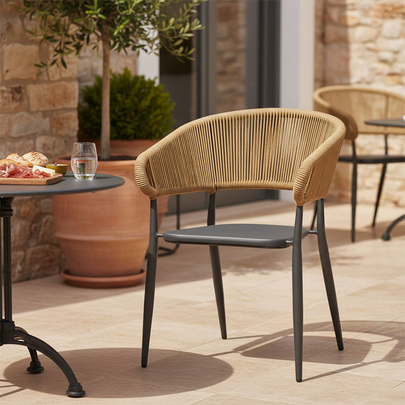 * Έδρα κατασκευασμένη από textilene. Το textilene είναι ένα εξαιρετικά ανθεκτικό υλικό που χρησιμοποιείται ευρέως σε επίπλωση εξωτερικών χώρων και εξαρτήματα. Αποτελείται από πολυεστερικές ινώδεις που επικαλύπτονται με PVC (πολυβινυλοχλωρίδιο), δημιουργώντας ένα υλικό που συνδυάζει ανθεκτικότητα, αντοχή στις καιρικές συνθήκες και εύκαμπτη υφή. Το υλικό αυτό επιτρέπει τη διέλευση του αέρα, βοηθώντας στη διατήρηση μιας δροσερής αίσθησης κατά τη χρήση.