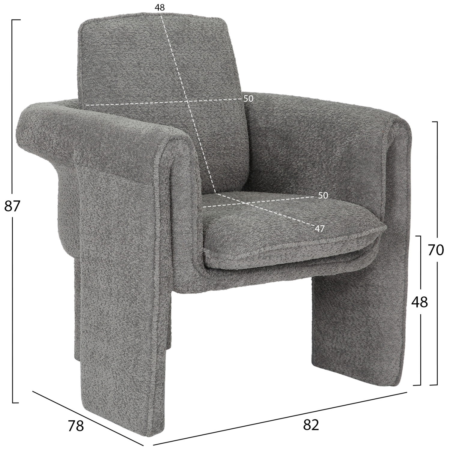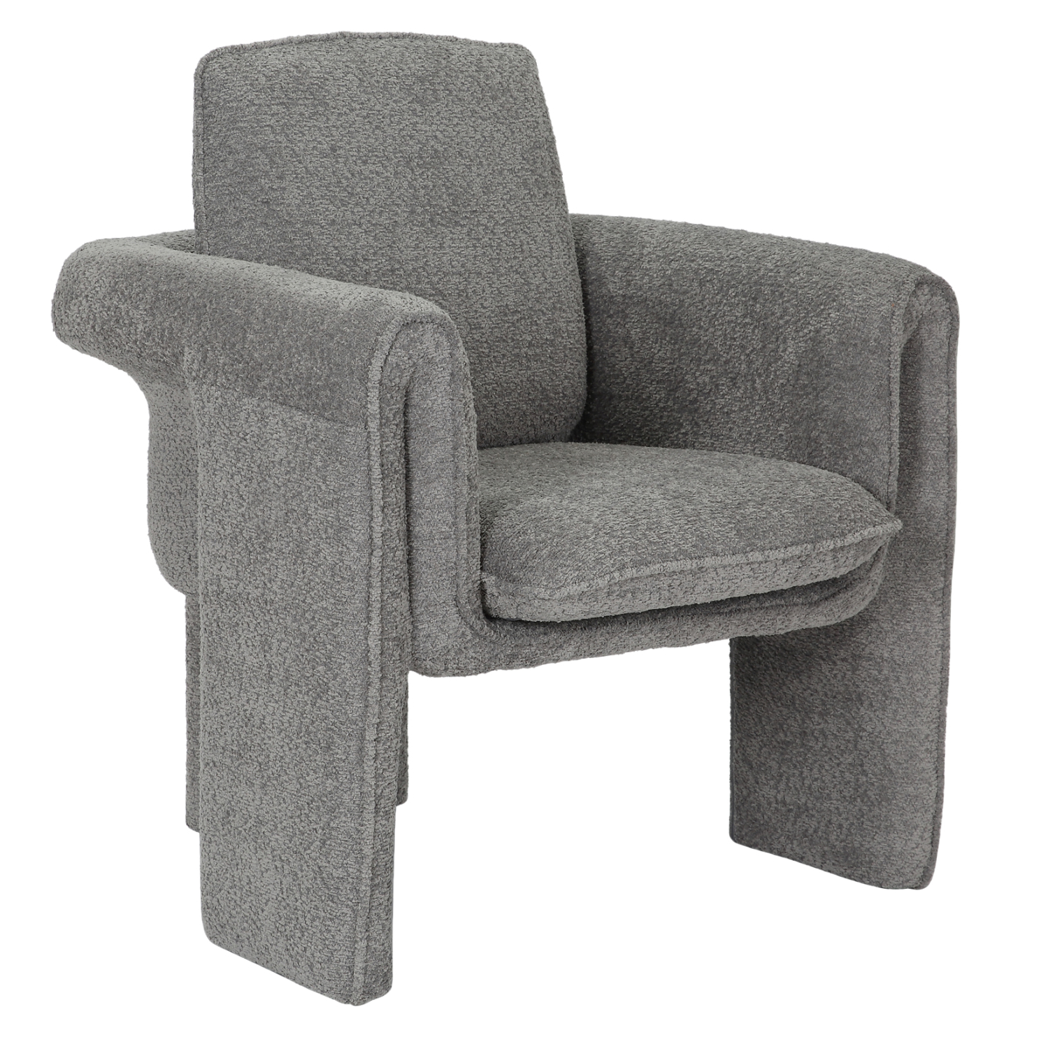 Ο σκελετός της πολυθρόνας είναι μεταλλικός με ηλεκτροστατική βαφή, ενώ ολόκληρη η επένδυση έχει γίνει με μπουκλέ ύφασμα εξαιρετικής ποιότητας και υφής. Μπουκλέ λέγεται οποιοδήποτε ύφασμα που έχει κόμπο-μπούκλα στην ύφανσή του. Κατασκευάζεται από σχεδόν όλες τις πρώτες ύλες (αν και συνήθως είναι συνθετικό) με ειδικές κλωστές με κόμπους ή πολύ στριμμένα νήματα, έτσι ώστε να έχει σγουρή επιφάνεια. Δεν τσαλακώνει και μπορεί να είναι μονόχρωμο, μελανζέ ,καρώ ή τουιντ.