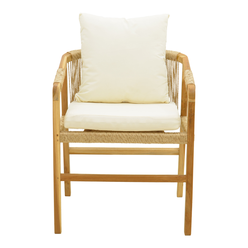 - Η πολυθρόνα συνοδεύεται από μαλακά, άνετα μαξιλάρια σε ουδέτερη απόχρωση, τα οποία συμπληρώνουν αρμονικά την ξύλινη και σχοινένια υφή