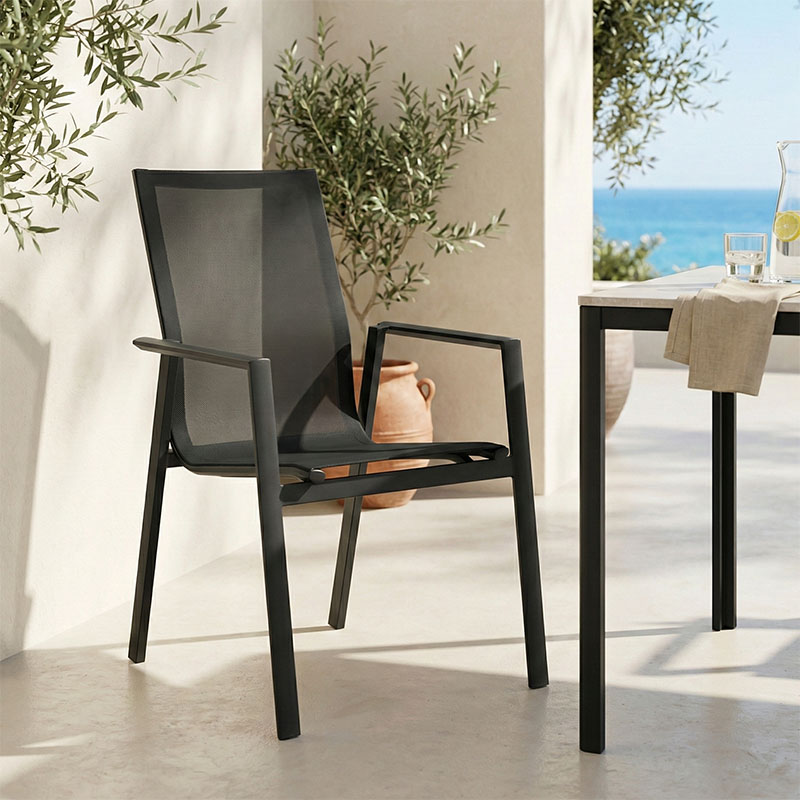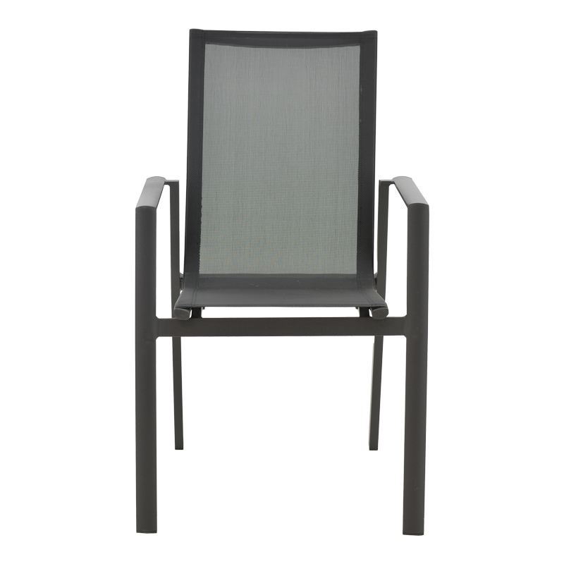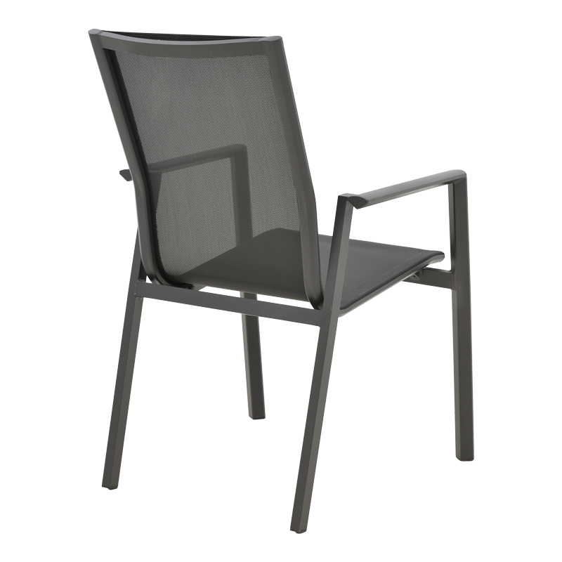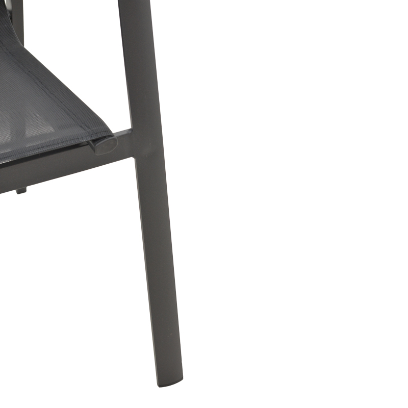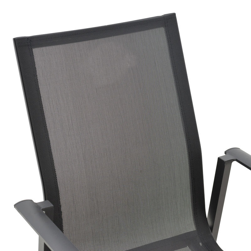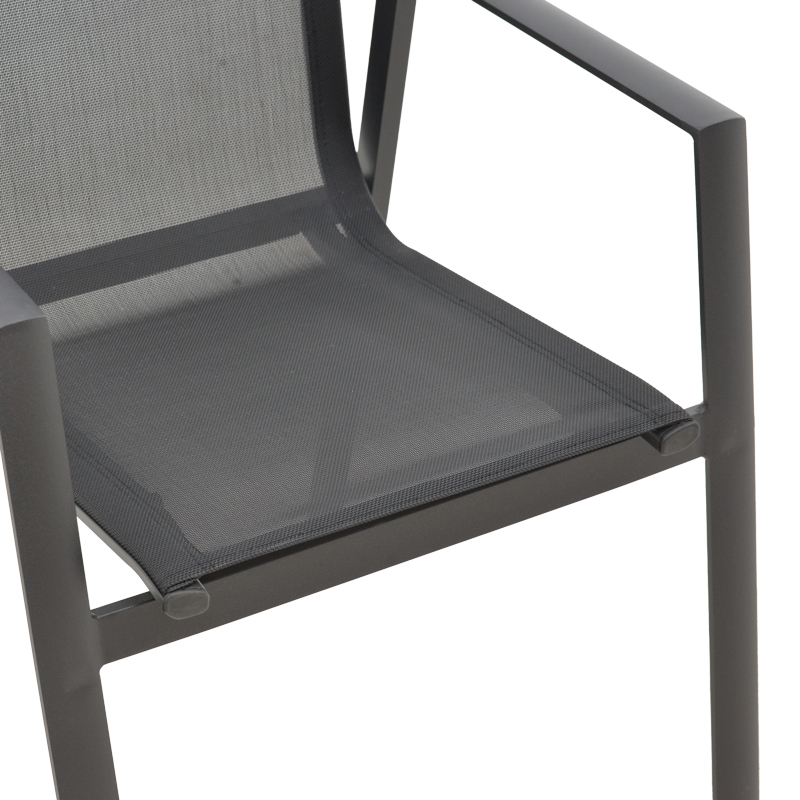 - Σταθερός σκελετός από εξαιρετικής ποιότητας αλουμίνιο με αντοχή στην καταπόνηση και στη φθορά. Κυρίως σώμα καρέκλας από εξαιρετικής ποιότητας textilene. Το textilene είναι ύφασμα μεγάλης αντοχής στην ηλιακή ακτινοβολία και την υγρασία ενώ παράλληλα αφήνει το δέρμα να “αναπνέει” δημιουργώντας έτσι άνεση στο κάθισμα.