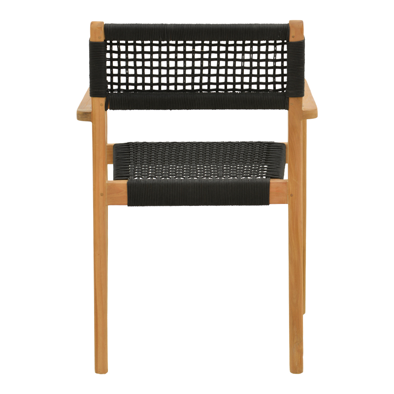 - Το κάθισμα και η πλάτη είναι περίτεχνα πλεγμένα με ανθεκτικό σχοινί σε μαύρη απόχρωση, δημιουργώντας ένα ελκυστικό, διαπνέον μοτίβο. Αυτή η λεπτομέρεια όχι μόνο προσθέτει μια μοναδική υφή και ένα φυσικό, ρουστίκ στοιχείο, αλλά εξασφαλίζει και εξαιρετική άνεση, προσαρμοζόμενη στο σώμα.