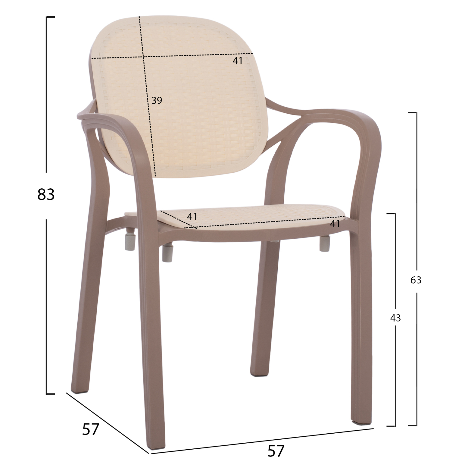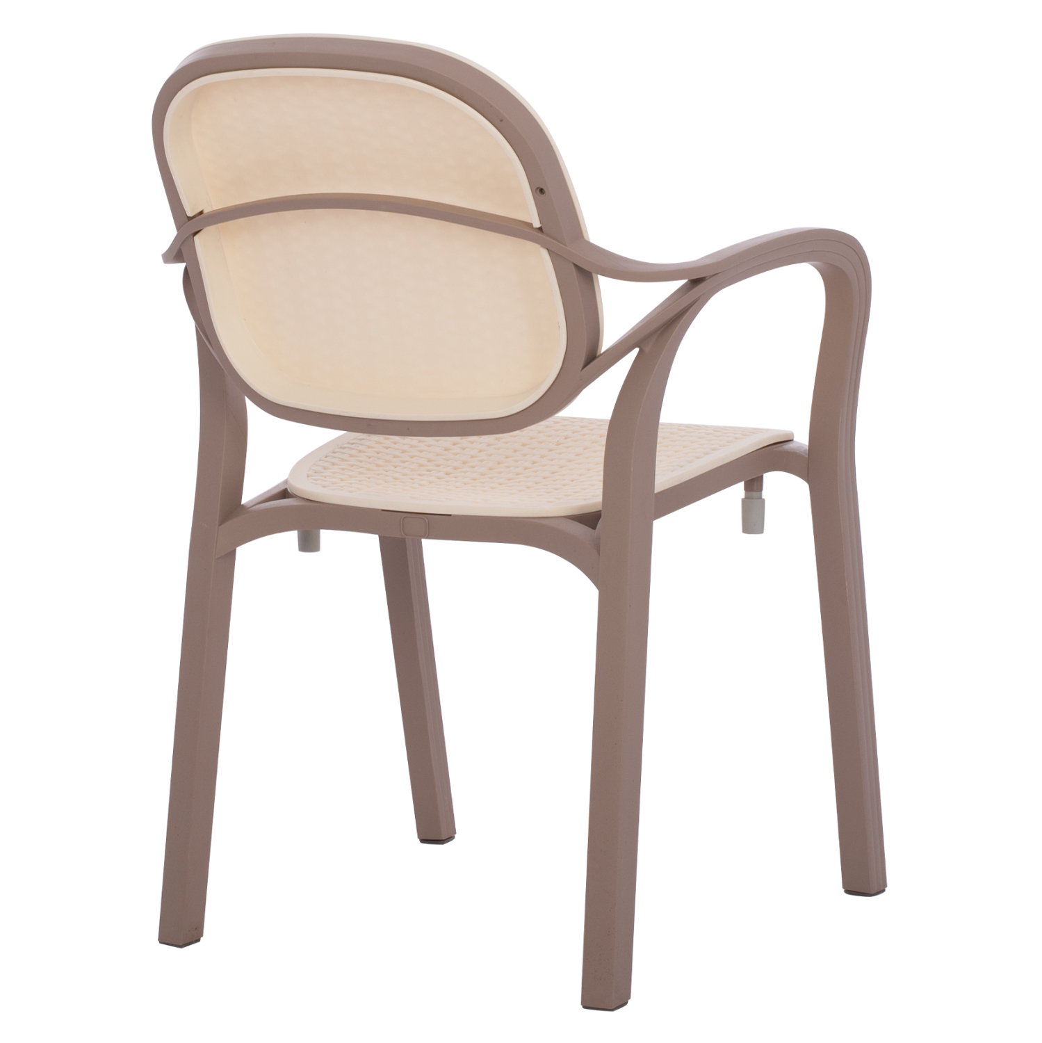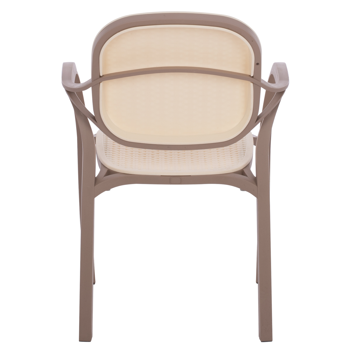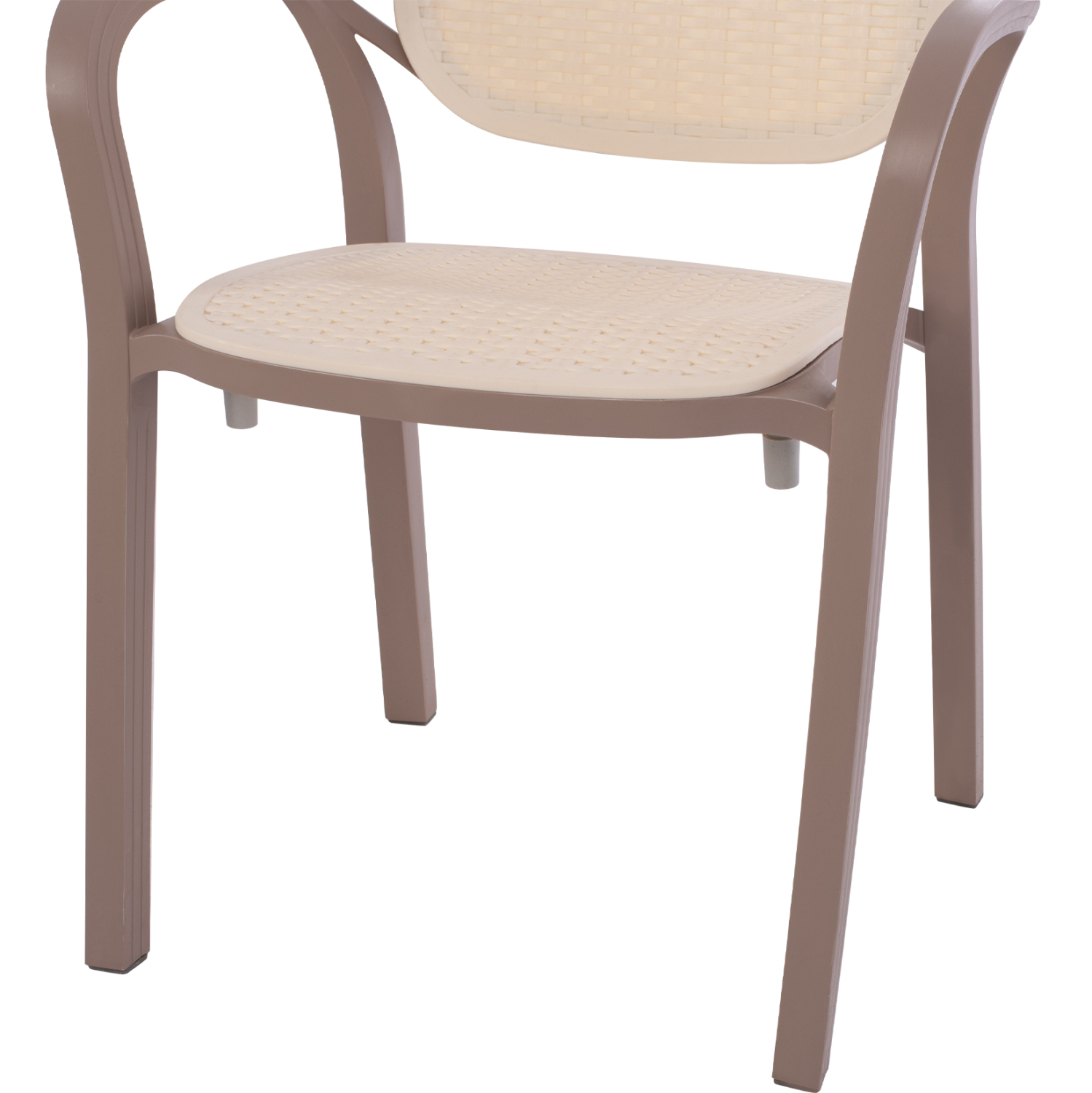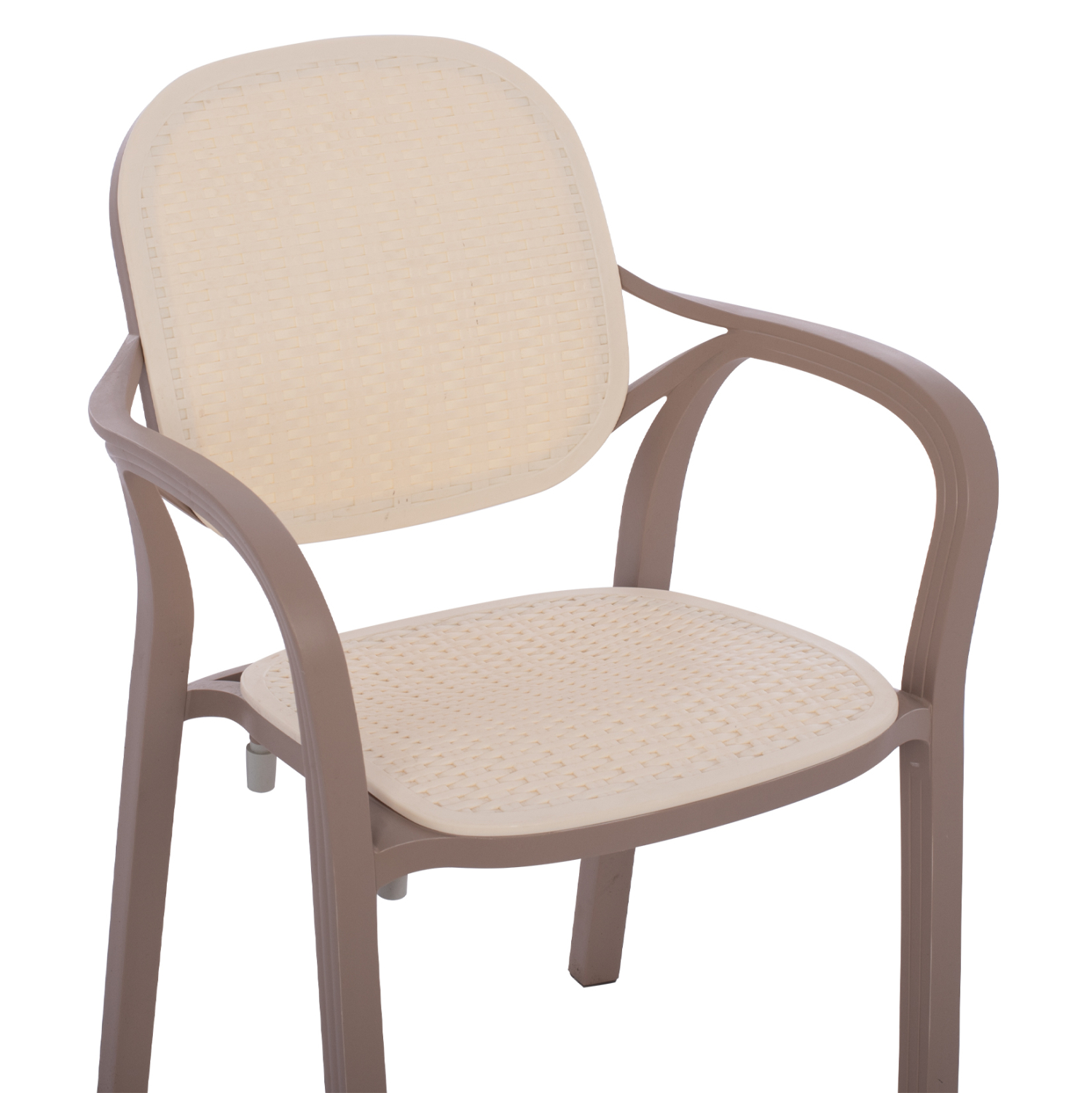 Πολυθρόνα πολυπροπυλενίου σε καπουτσίνο χρώμα με μπεζ απόχρωση στην πλάτη και στο κάθισμα. Ιδανική πρόταση τόσο για εξωτερικούς, όσο και για εσωτερικούς χώρους. Η πολυθρόνα έχει ψηλά μπράτσα και το κάθισμα και η πλάτη τους έχουν όψη rattan. Ιδανικές για επαγγελματικούς χώρους αλλά και για το σπίτι σας, θα σας χαρίσουν άνεση και ξεκούραση χάρη στην όμορφη σχεδίαση του καθίσματός τους και στα ψηλά τους μπράτσα με στρογγυλεμένες γωνίες.