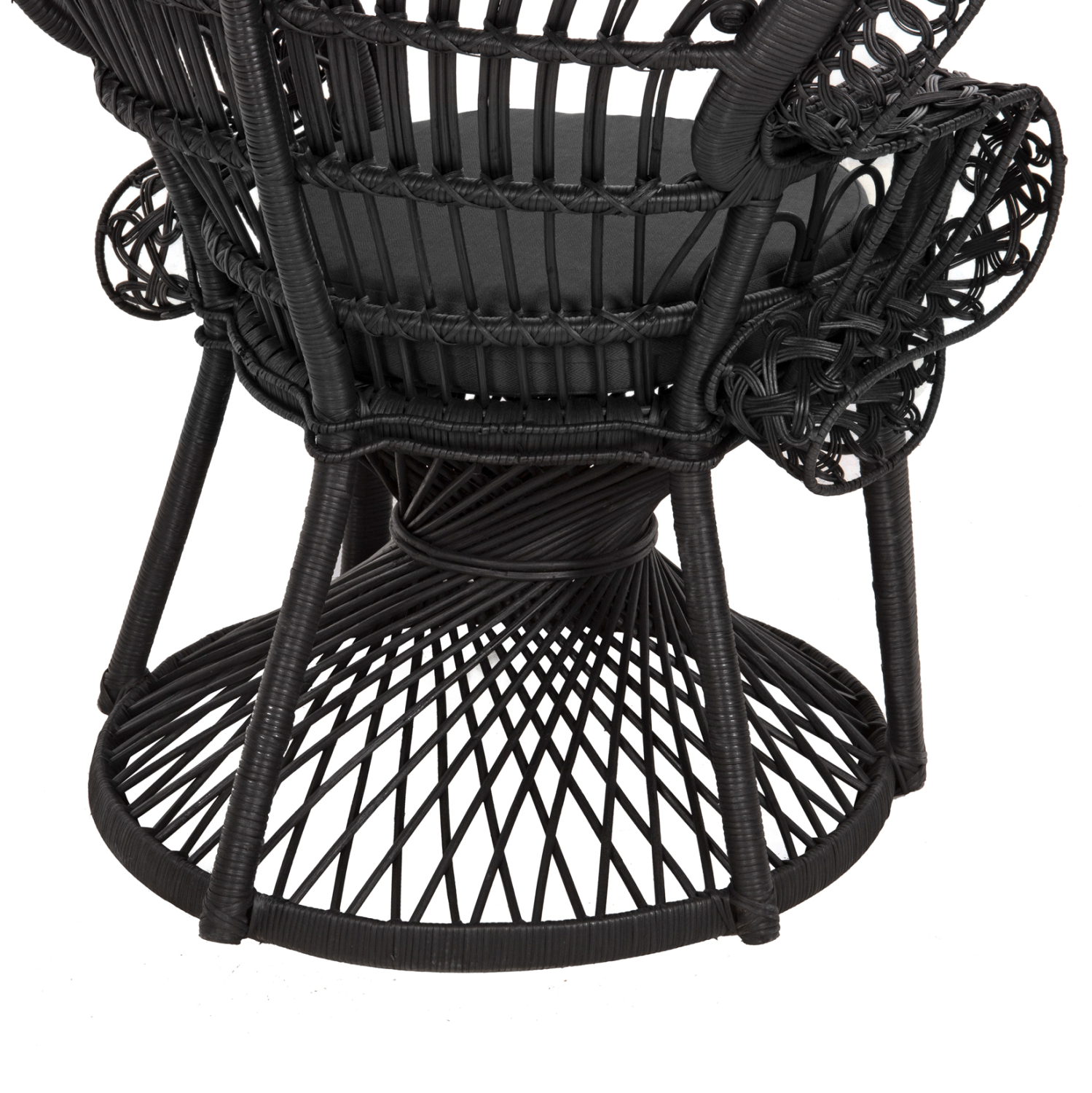 Η πολυθρόνα ROYAL PEACOCK από Rattan σε ΜΑΥΡΟ χρώμα είναι εντυπωσιακή και σίγουρα θα αφήσει το στίγμα της σε όποιο σαλόνι κι αν τοποθετηθεί. Το κάθισμά της είναι στρογγυλό και στηρίζεται σε μια εντυπωσιακή «πλεκτή» κυλινδρική βάση πάνω στην οποία υπάρχει το ΜΑΥΡΟ αναπαυτικό μαξιλάρι. Αλλά ακόμα πιο εντυπωσιακή είναι η κατασκευή των μπράτσων και της πλάτης. Το Rattan πλέκεται αριστοτεχνικά δημιουργώντας πανέμορφα σχέδια και οι διαστάσεις της πολυθρόνας τονίζουν ακόμα περισσότερο την τέχνη που υπάρχει στην κατασκευή της!