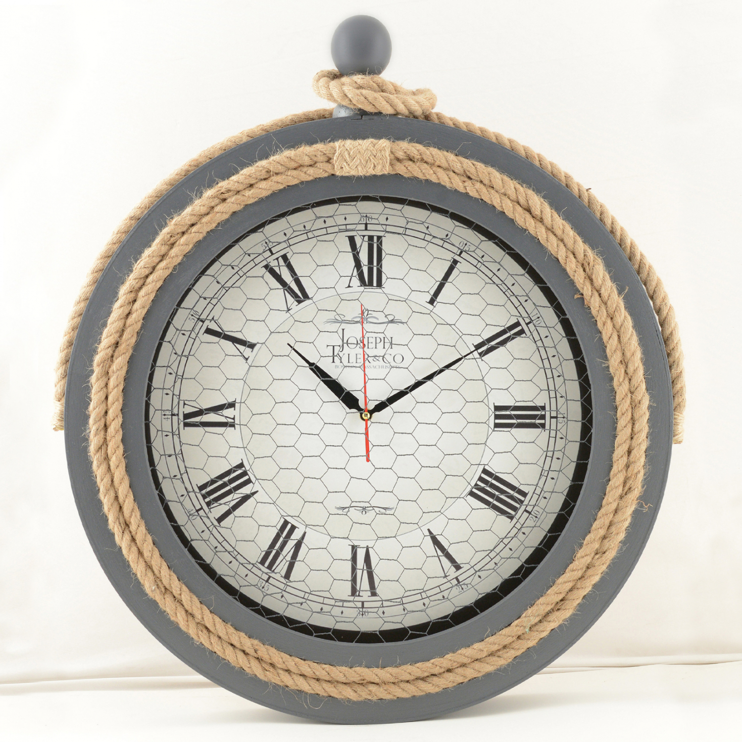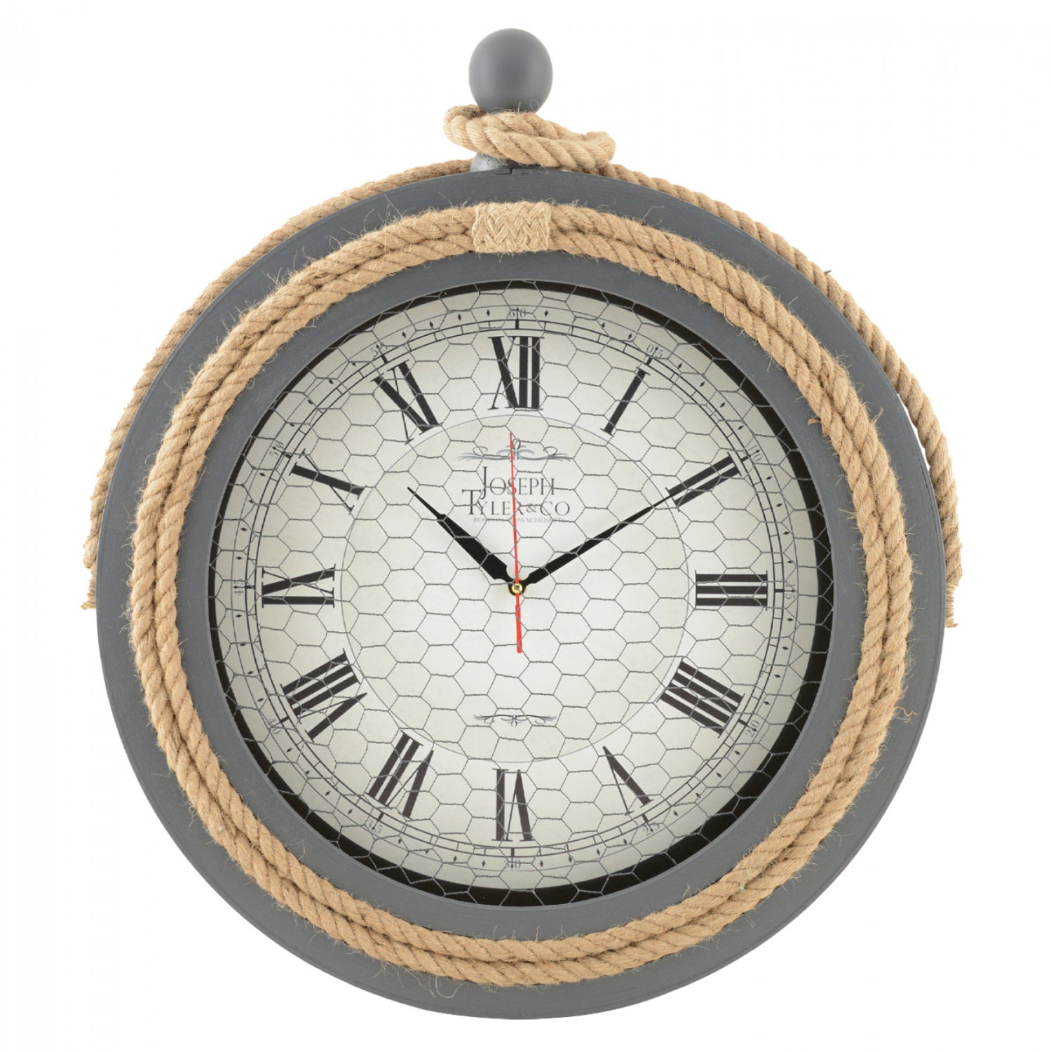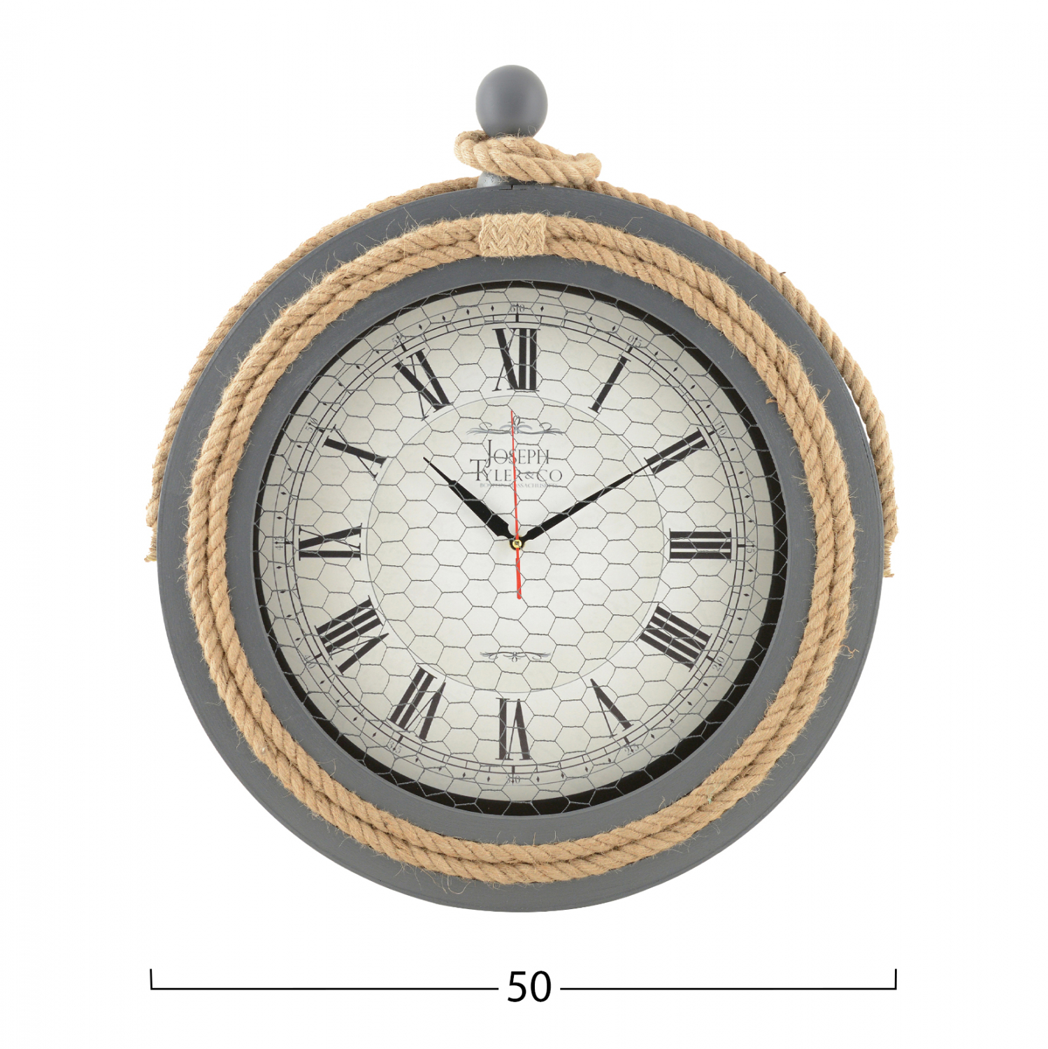 Ρολόι τοίχου σε γκρι απόχρωση με σχοινί και μεταλλικό πλέγμα.
