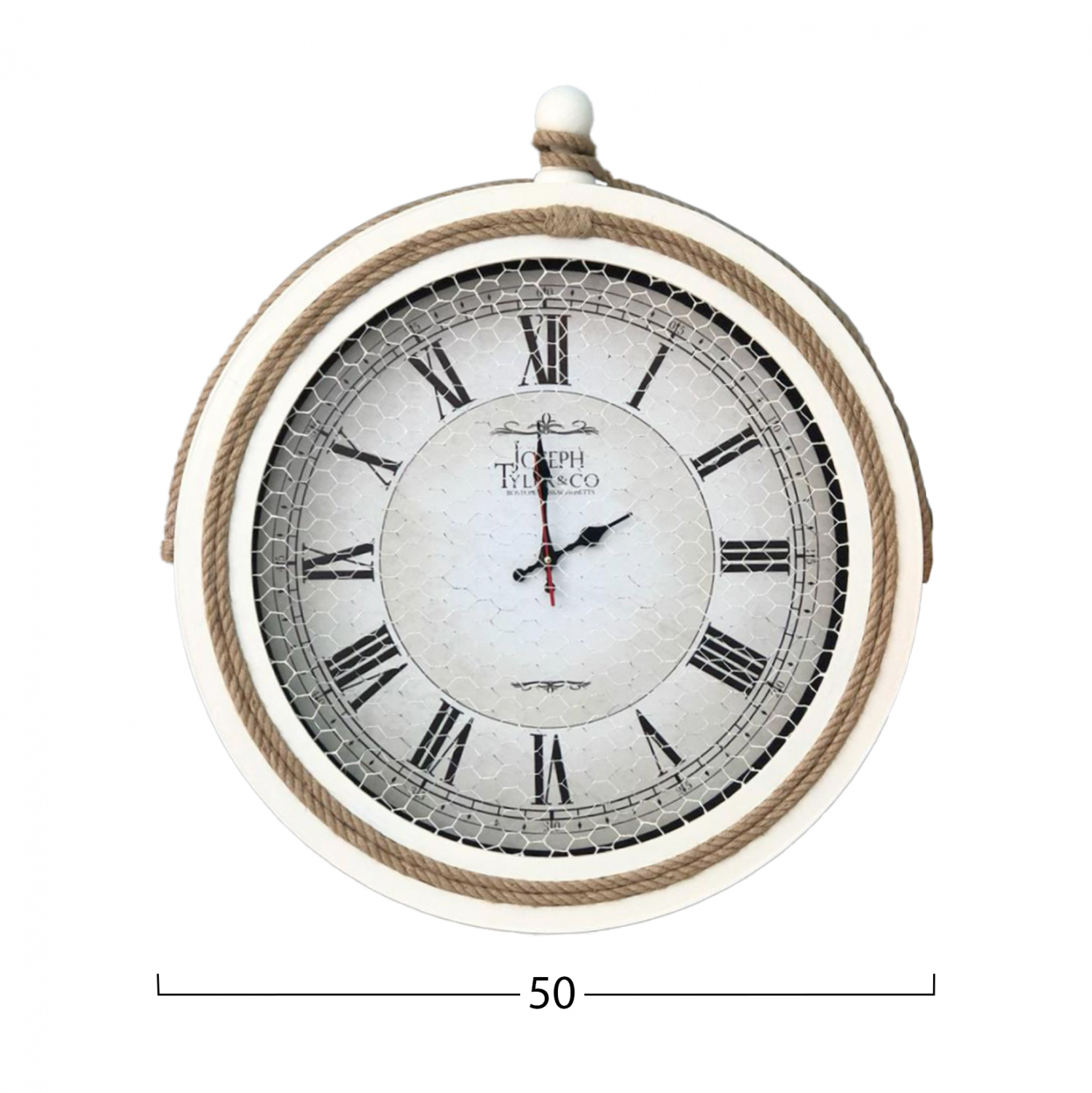 Ρολόι τοίχου σε λευκή απόχρωση με σχοινί και μεταλλικό πλέγμα.