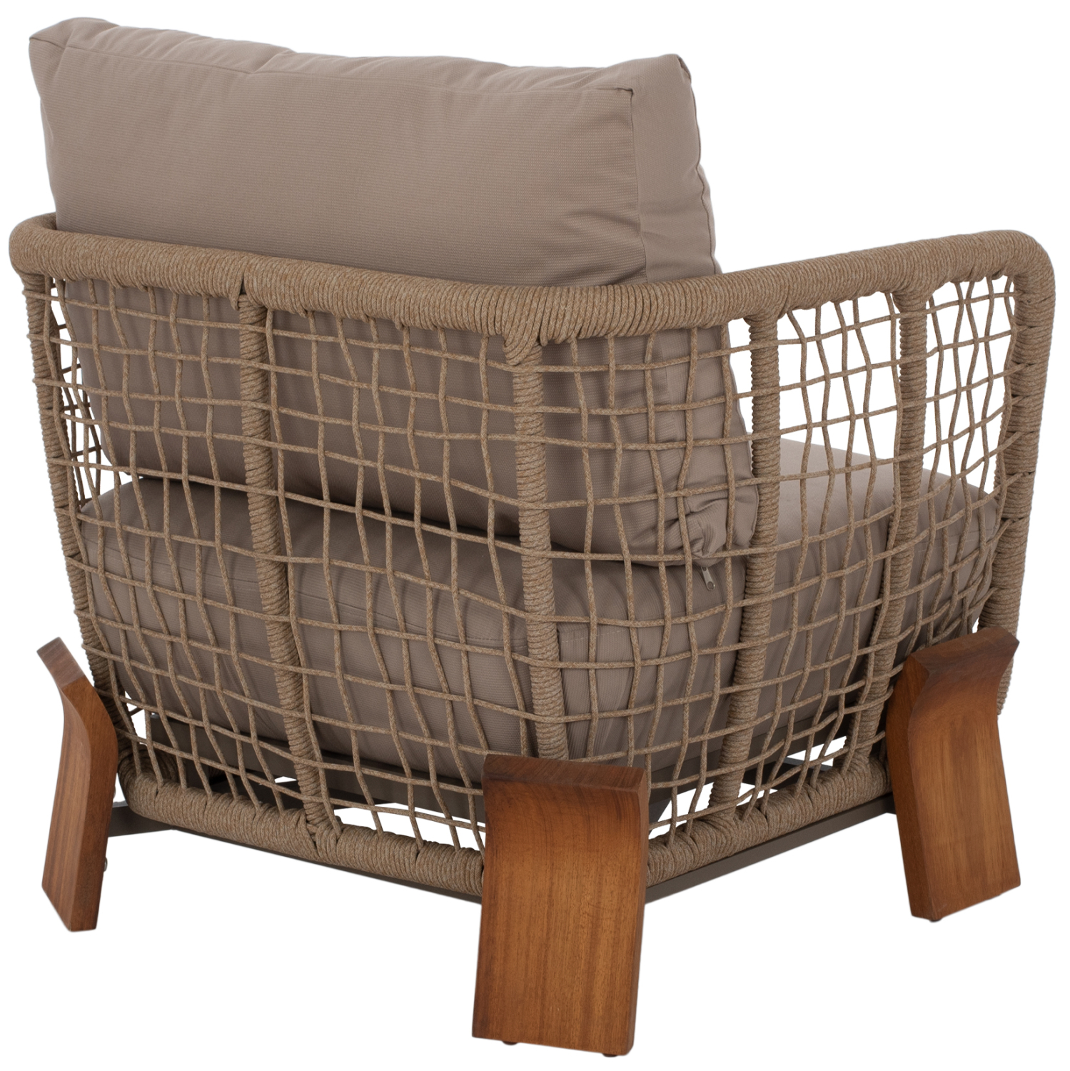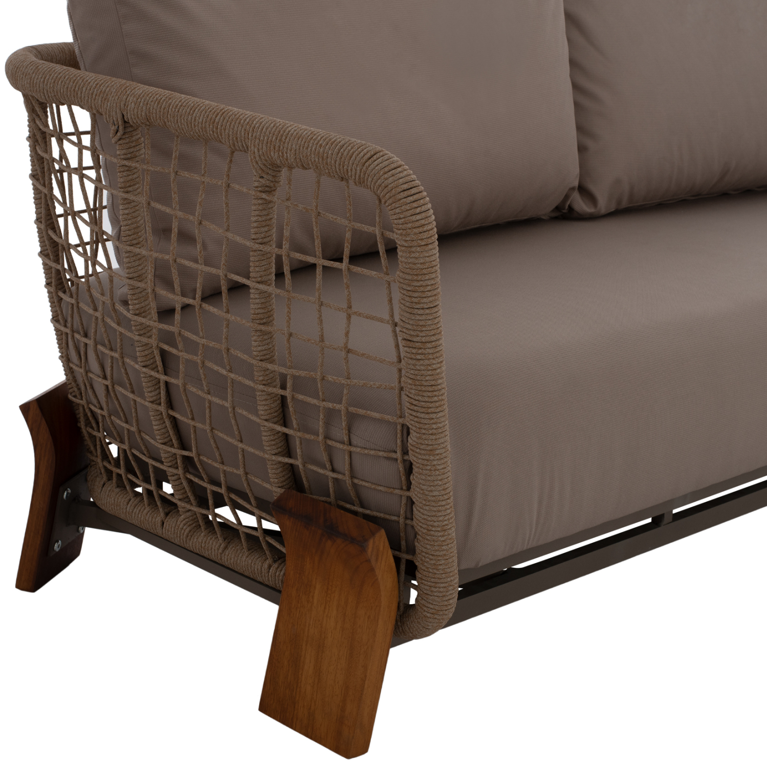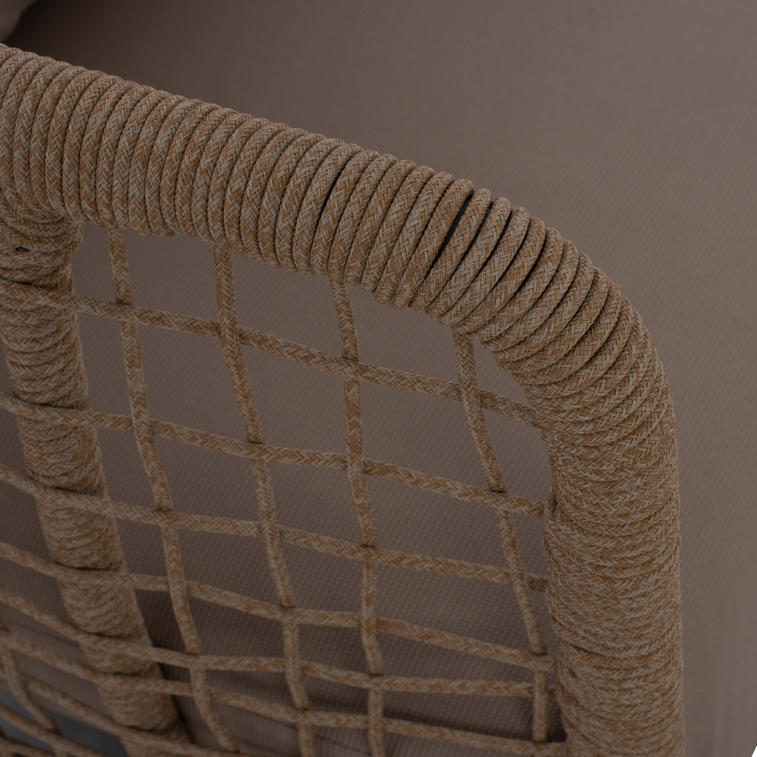 ΗΜ5884.01—Σας παρουσιάζουμε το εντυπωσιακό, νέο και χειροποίητο σετ εξωτερικού χώρου με κυρίαρχο χρώμα το ΜΠΕΖ. Αποτελείται από ένα τραπεζάκι, 2 πολυθρόνες και έναν 3-θέσιο καναπέ. Ένα σετ που θα το λατρέψετε με την πρώτη ματιά. Το όμορφο τραπέζι έχει σχήμα οβάλ και έχει επιφάνεια από γυαλί ασφαλείας, ενώ η βάση του είναι ολόκληρη με σχοινί δεμένο επάνω στον αλουμινένιο σκελετό του. Οι πολυθρόνες είναι εξίσου εντυπωσιακές. Τα πόδια τους είναι 4 κομμάτια από μασίφ ξύλο ΙΡΟΚΟ ενώ το σχοινί επάνω στον αλουμινένιο σκελετό προσδίδει ομοιομορφία με το τραπέζι. Το κάθισμά τους είναι φαρδύ ενώ σε συνδυασμό με τα αναπαυτικά μαξιλάρια τόσο στο κάθισμα όσο και στην πλάτη προσφέρουν ξεκούραση και άνεση. Ο 3-θέσιος καναπές σε παρόμοιο design είναι και αυτός εντυπωσιακός και συμπληρώνει το σετ με τον καλύτερο δυνατό τρόπο. Τα μαξιλάρια σε όλο το σετ είναι επενδυμένα με ποιοτικό ύφασμα σε ΜΠΕΖ χρώμα και διαθέτουν γέμισμα με μέτριας σκληρότητας αφρώδη υλικά για την μεγαλύτερη δυνατή άνεση. Τι άλλο να ζητήσει κανείς για να αναβαθμίσει τον κήπο, το μπαλκόνι ή την αυλή του;