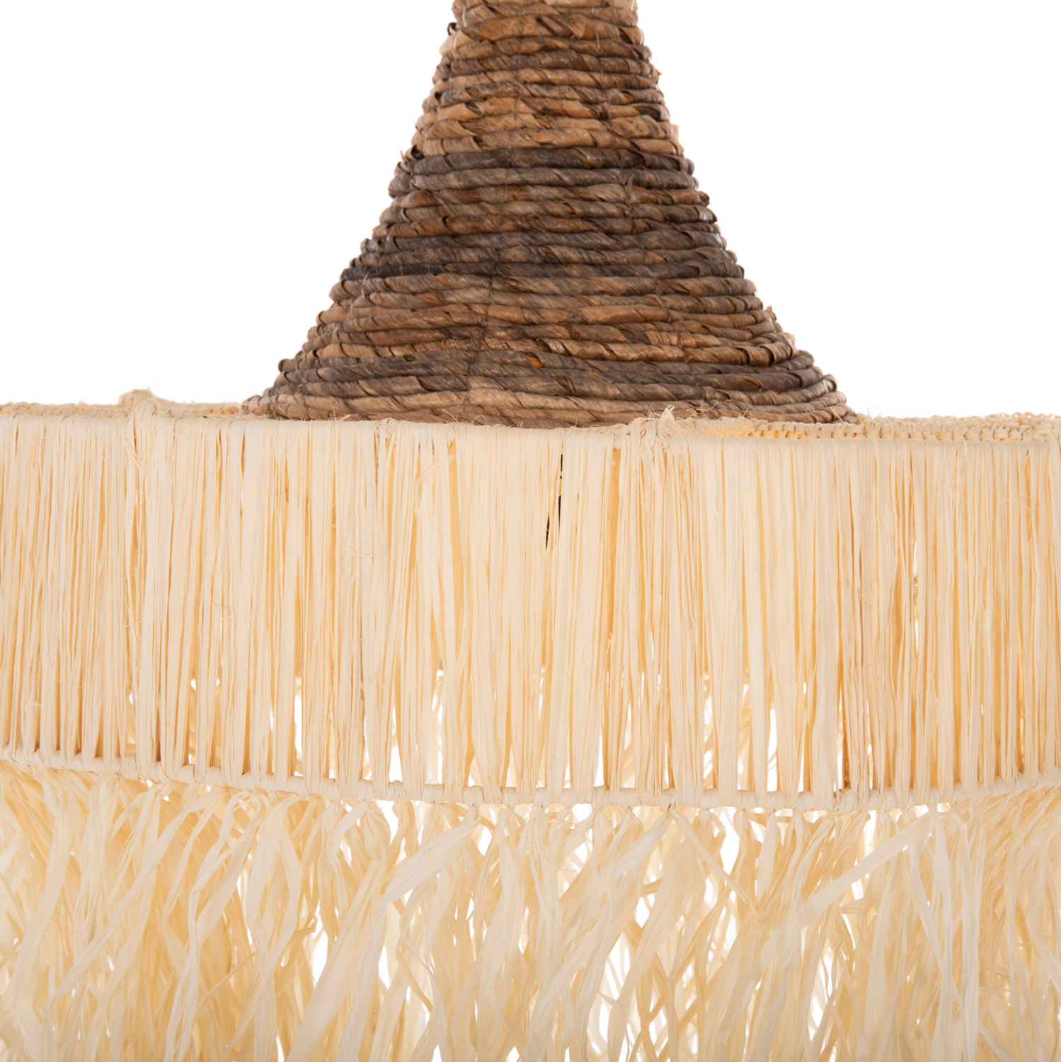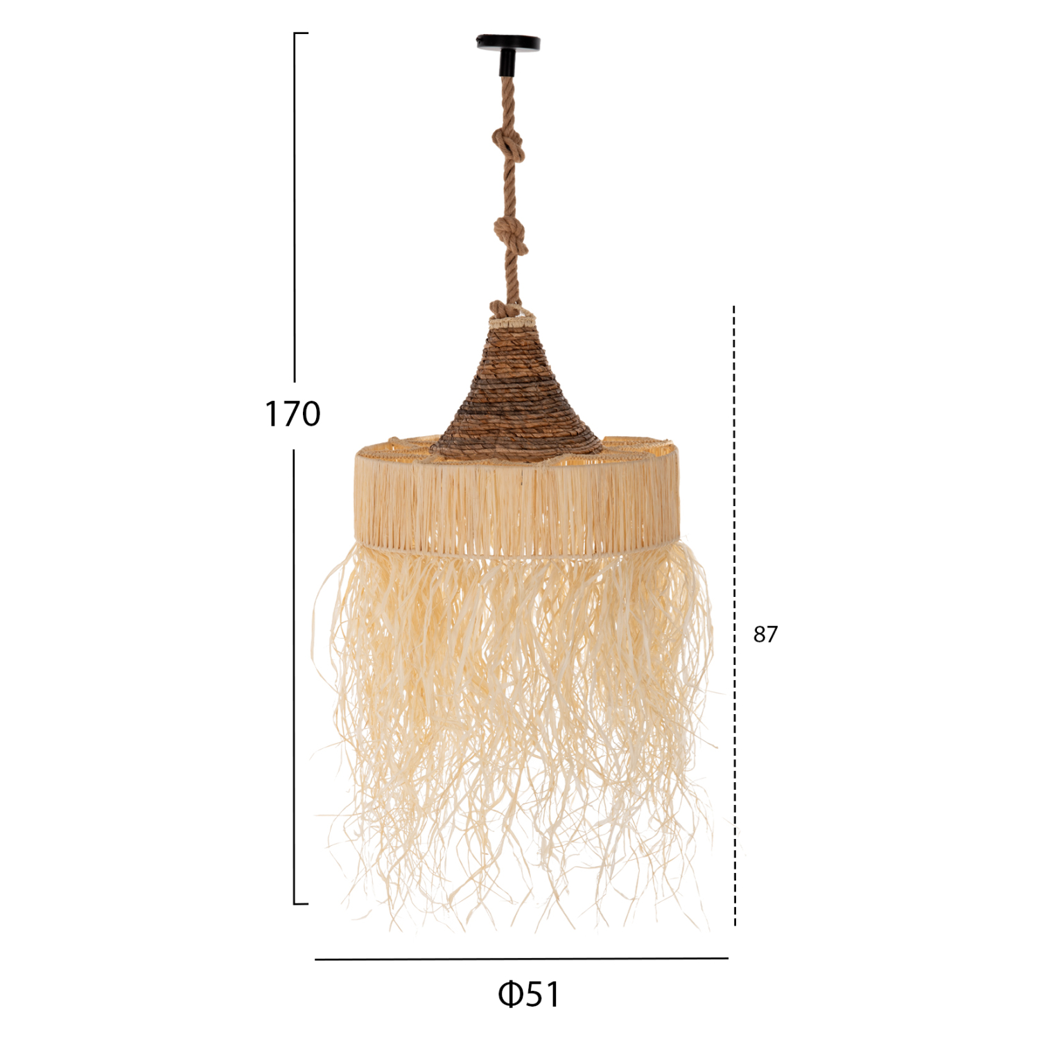 Hm11922- Kρεμαστό φωτιστικό—- Αν επιθυμείτε να διακοσμήσετε το χώρο σας με ένα φωτιστικό σε boho στυλ με εξωτικά υλικά και να το συνδυάσετε με την τελευταία τάση στην διακόσμηση που είναι το σχοινί, αυτό είναι η καλύτερη επιλογή. Είναι ένα μονόφωτο με «καπέλο» σε κυλινδρικό σχήμα φτιαγμένο από ίνες φύλλων φοίνικα με κρόσια, σε ΦΥΣΙΚΟ χρώμα. Στο χερούλι κρέμασης αυτού του φωτιστικού προσαρμόζεται το σχοινί από το οποίο κρεμιέται από την οροφή.