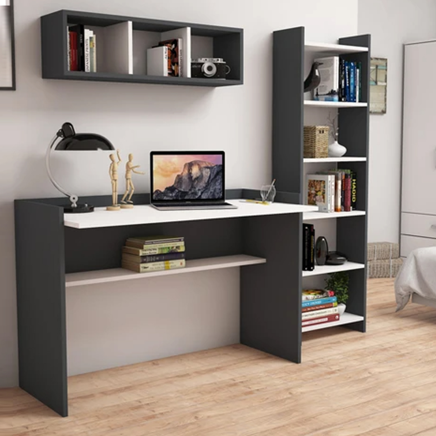 Σετ γραφείου με κομψό και λιτό σχεδιασμό, αποτελούμενο από γραφείο, ραφιέρα τοίχου και βιβλιοθήκη, κατασκευασμένα από ανθεκτική μελαμίνη πάχους 18 χιλιοστών υψηλής ποιότητας, σε γκρι απόχρωση με λευκές λεπτομέρειες.