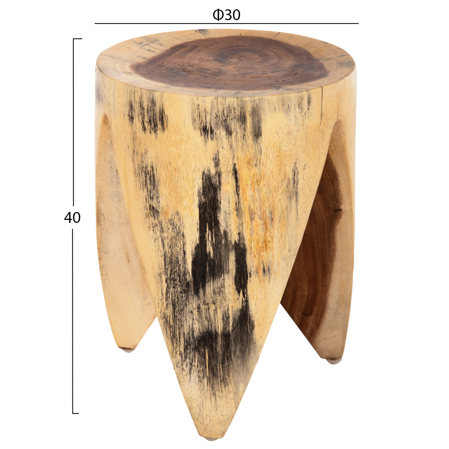 Φ30x40Y εκ.—*Οι διαστάσεις είναι ενδεικτικές. Μπορεί να υπάρχουν διαφορές στις διαστάσεις του προϊόντος λόγω των διαστάσεων του επεξεργασμένου ξύλου. Οι υπάρχουσες ρωγμές ή αυτές που ενδέχεται να δημιουργηθούν με την πάροδο του χρόνου οφείλονται στην συστολή-διαστολή του ζωντανού οργανισμού που λέγεται μασίφ ξύλο, και δεν αποτελούν κατασκευαστικό ελάττωμα, δίνοντας πρωτοτυπία και μοναδικό design στο χώρο σας. Κατά τη διαδικασία παραγωγής γίνεται ομοιομορφοποίηση και σταθεροποίηση των ρωγμών που υπάρχουν, με υλικό κατασκευασμένο από το ίδιο ξύλο. Επομένως, μπορεί να υπάρχουν χρωματικές παραλλαγές και διαφορές στις διαστάσεις του προϊόντος λόγω των διαστάσεων του επεξεργασμένου ξύλου. Αυτά δεν αποτελούν ελάττωμα του προϊόντος.