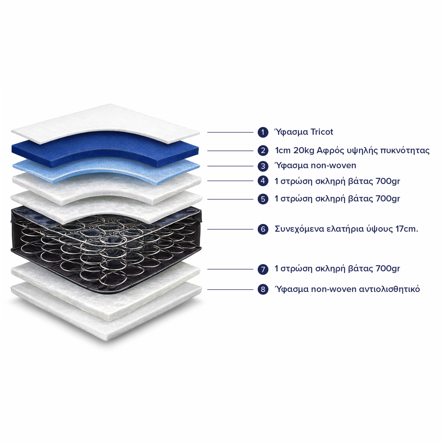 Στο κάτω μέρος του στρώματος υπάρχουν στρώσεις από σκληρό αφρολέξ και non-woven ύφασμα στο τελείωμα.