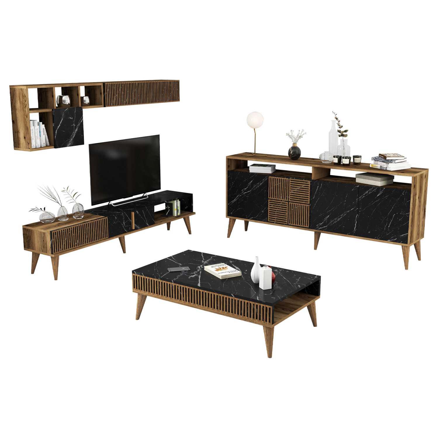 Η σύνθεση ΗΜ11845.02 θα αλλάξει την όψη στο σαλόνι σας και θα σας προσφέρει την αναβάθμιση που θέλετε. Αποτελείται από έναν συνδυασμό επίπλων για την τηλεόρασή σας με μονάδα δαπέδου και επιτοίχια ράφια, ένα τραπεζάκι σαλονιού, και έναν μπουφέ. Όλη η σύνθεση είναι της ίδιας σειράς και τα κυρίαρχα χρώματα είναι το ΚΑΡΥΔΙ και το ΜΑΥΡΟ ΜΑΡΜΑΡΟ.