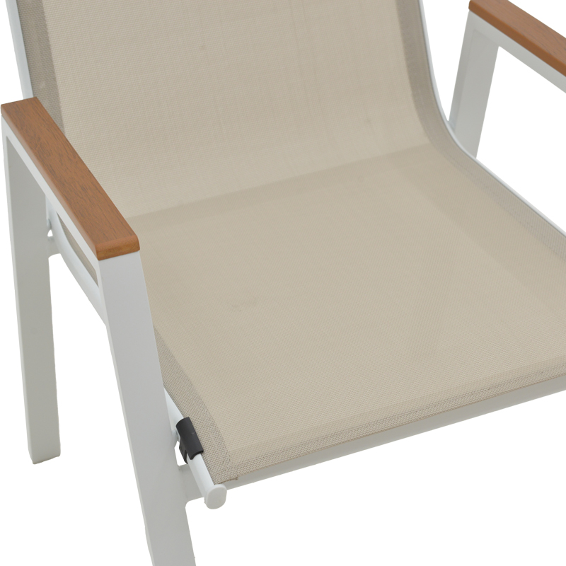 - Σταθερός σκελετός από αλουμίνιο και ύφασμα textilene. Το textilene είναι ύφασμα μεγάλης αντοχής στην ηλιακή ακτινοβολία και την υγρασία ενώ παράλληλα αφήνει το δέρμα να “αναπνέει” δημιουργώντας έτσι άνεση στο κάθισμα. To αλουμίνιο παρέχει ανθεκτικότητα και ελαφριά κατασκευή, καθιστώντας την πολυθρόνα εύκολη στη μετακίνηση και την αποθήκευση. Eίναι επίσης ανθεκτικό στη διάβρωση και δεν συντηρεί σκουριά, καθιστώντας την κατάλληλη για χρήση σε εξωτερικούς χώρους.