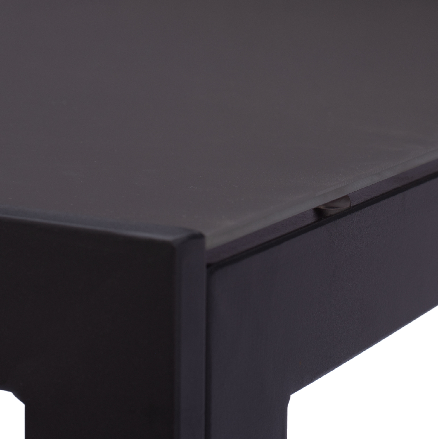 Τραπέζι εξωτερικού χώρου μεταλλικό σε γκρι απόχρωση με γυαλί στην επιφάνειά του.