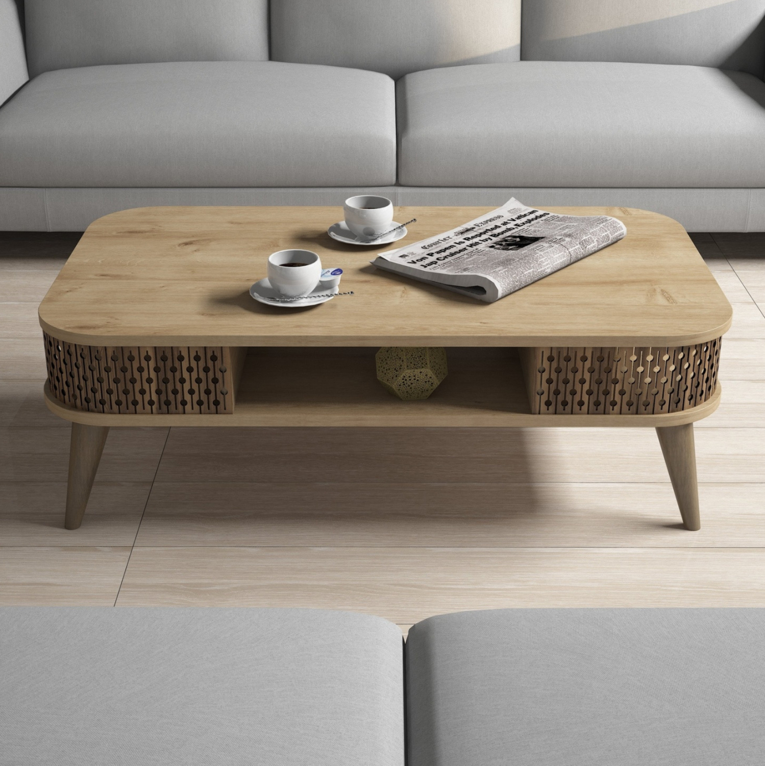 ΗΜ9501.01 τραπεζάκι σαλονιού—– Το τραπεζάκι αυτό είναι ένα όμορφο έπιπλο σε χρώμα φυσικού ΟΑΚ. Το όμορφο design του θα αλλάξει την εικόνα του σαλονιού ή του καθιστικού σας προς το καλύτερο. Πρόκειται για μια κατασκευή με μια ικανοποιητικού μεγέθους επάνω επιφάνεια. Από κάτω υπάρχουν 3 ανοιχτοί χώροι για τοποθέτηση αντικειμένων. Το χαρακτηριστικό, όμως, σε αυτό το τραπεζάκι είναι ότι οι γωνίες του είναι στρογγυλεμένες και οι καμπύλες είναι φτιαγμένες με διάτρητο σχέδιο στην μελαμίνη. Η κομψότητα, η ποιότητα και το minimal design χαρακτηρίζουν αυτό το τραπεζάκι, που έχει φτιαχτεί για εσένα.