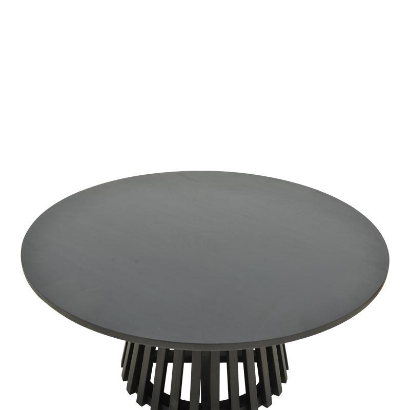 • Μοναδική Βάση “Ακτίνων”: Το πραγματικό highlight αυτού του τραπεζιού είναι η κωνική του βάση, σχηματισμένη από κάθετες ξύλινες “πλευρές” ή “ακτίνες”. Αυτό το ιδιαίτερο μοτίβο δημιουργεί ένα παιχνίδι φωτός και σκιάς, προσθέτοντας βάθος, υφή και μια μοντέρνα, αρχιτεκτονική πινελιά που το κάνει να ξεχωρίζει από οτιδήποτε άλλο.