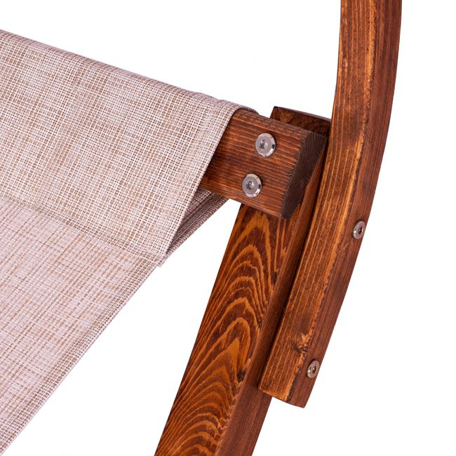 Κατασκευασμένη από ξύλο πεύκου σε καρυδί απόχρωση με textilene 2×2 και προσκέφαλο μπεζ.